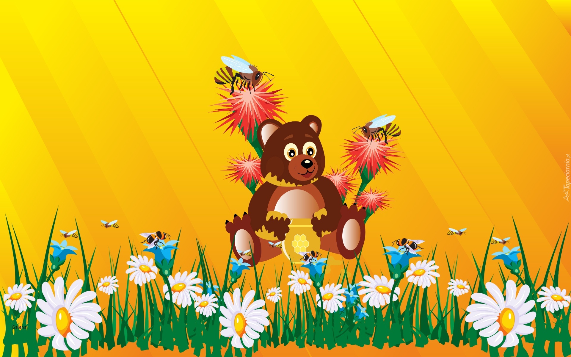Edytor tapety: Miś, Miód, Kwiaty, Pszczoły, Grafika, Dla dzieci
