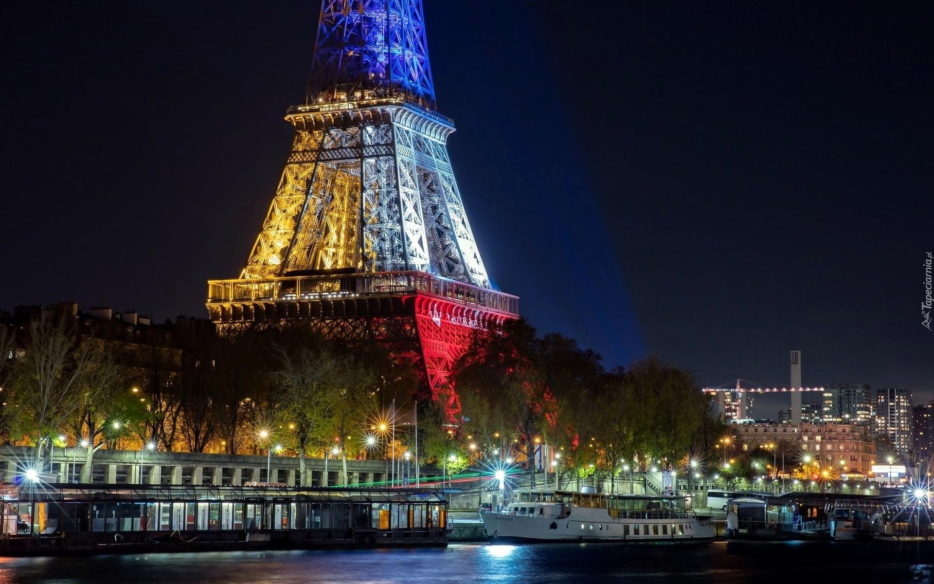 Edytor tapety: Oświetlona, Wieża Eiffla, Sekwana, Statki, Paryż, Nocą