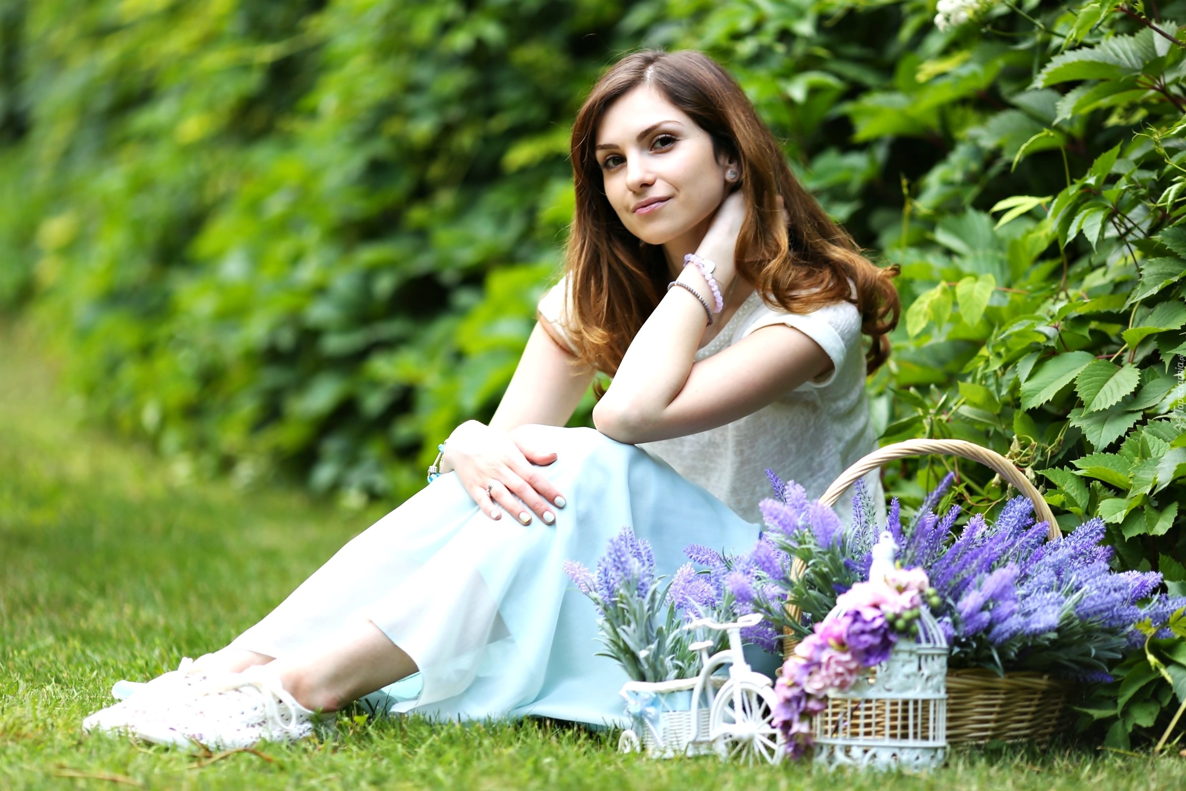 Edytor tapety: Kobieta, Zieleń, Kosz, Kwiaty, Lawenda