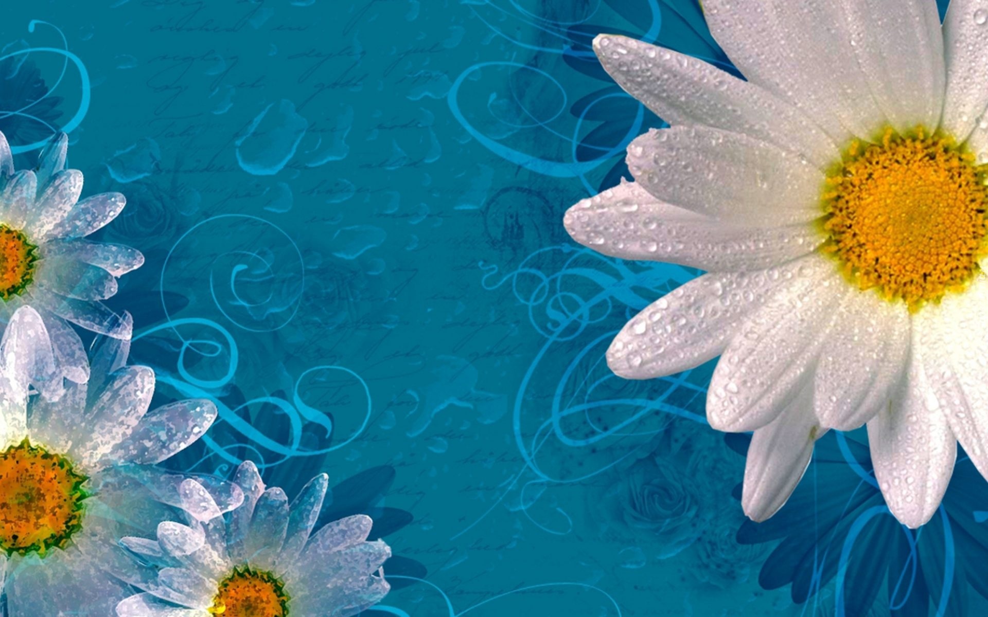 Edytor tapety: Grafika, Białe, Margerytki, Niebieskie, Tło