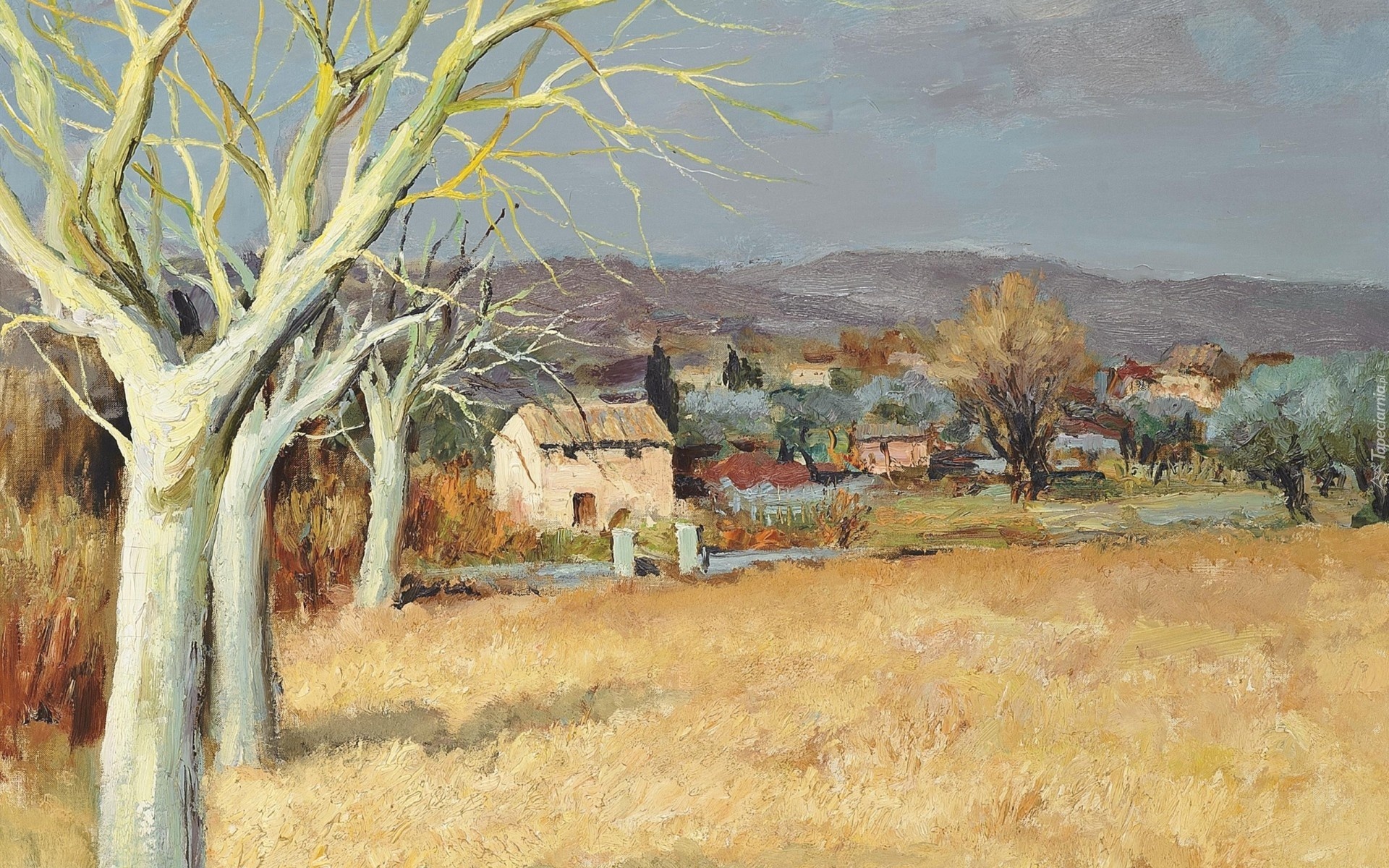 Edytor tapety: Malarstwo, Obraz, Pola, Domy, Drzewa