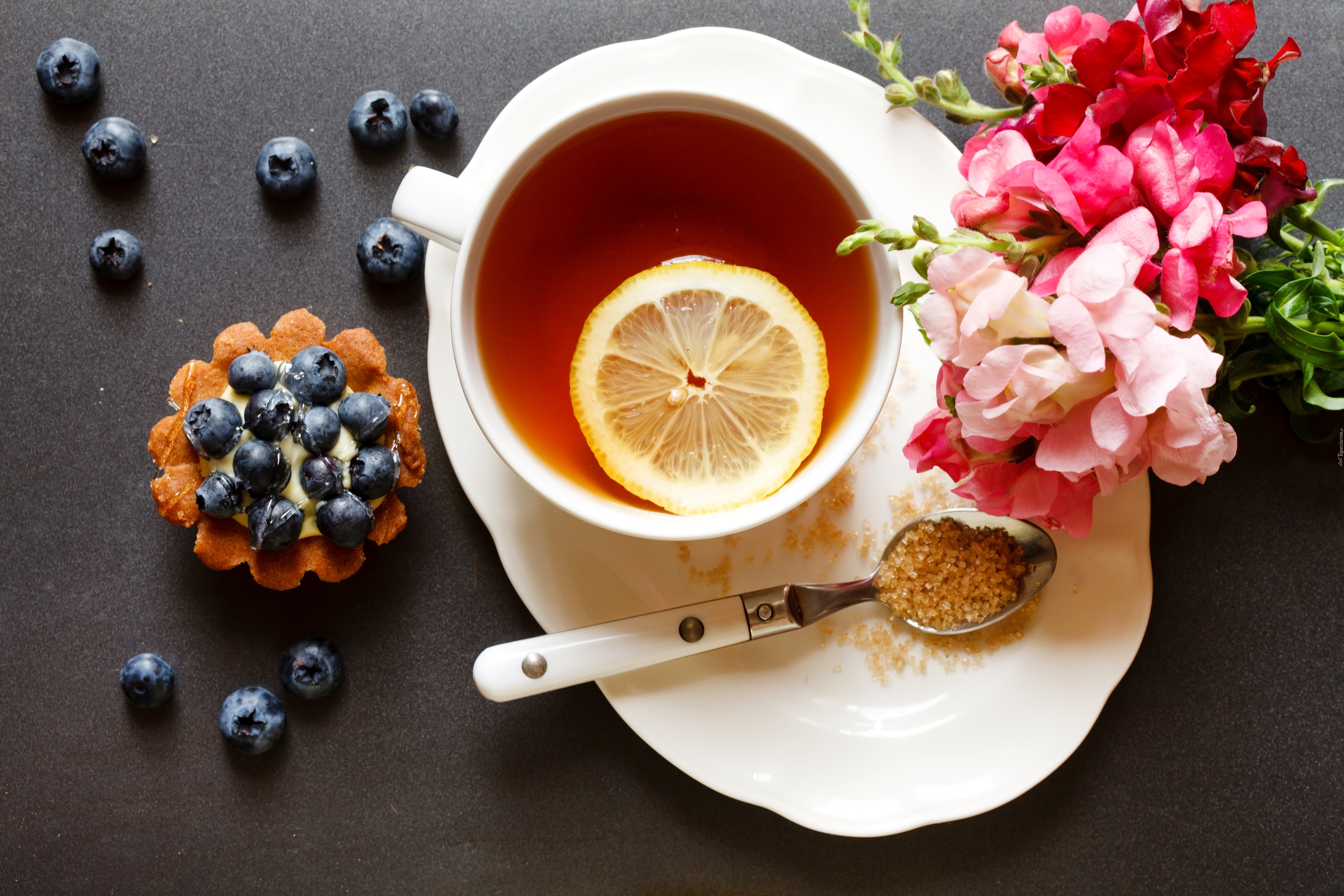 Edytor tapety: Herbata, Cytryna, Babeczka, Jagody, Kwiaty