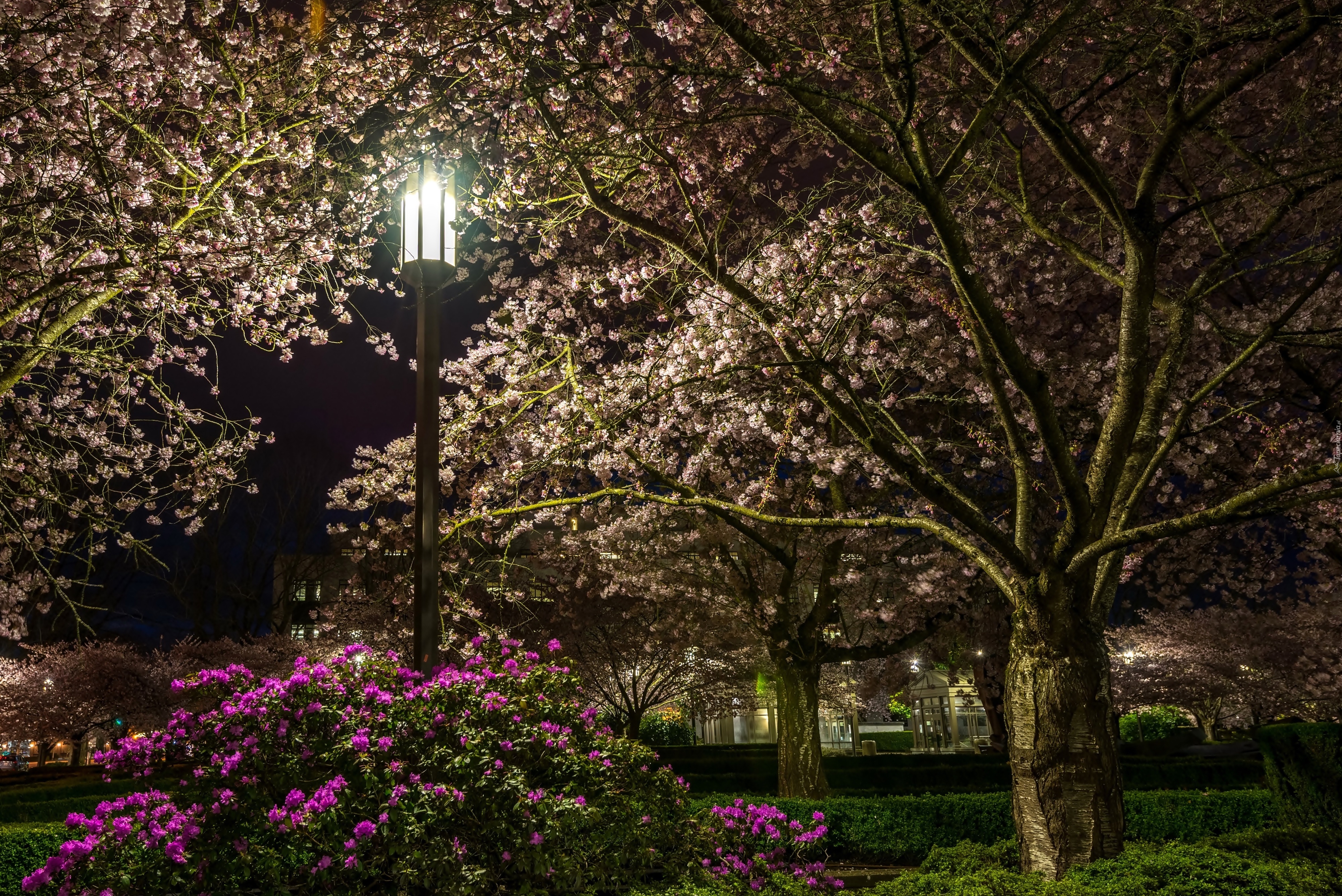 Edytor tapety: Park, Drzewa, Kwiaty, Latarnia, Noc