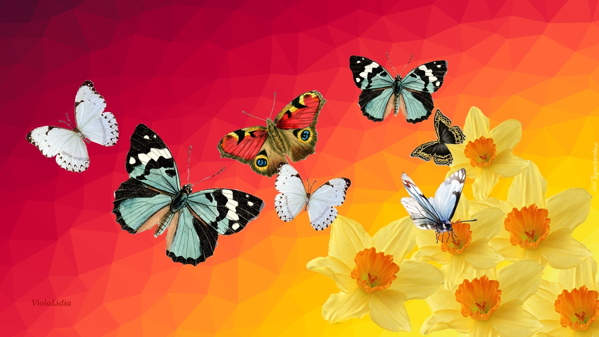 Edytor tapety: Grafika, Kwiaty, Żonkile, Motyle