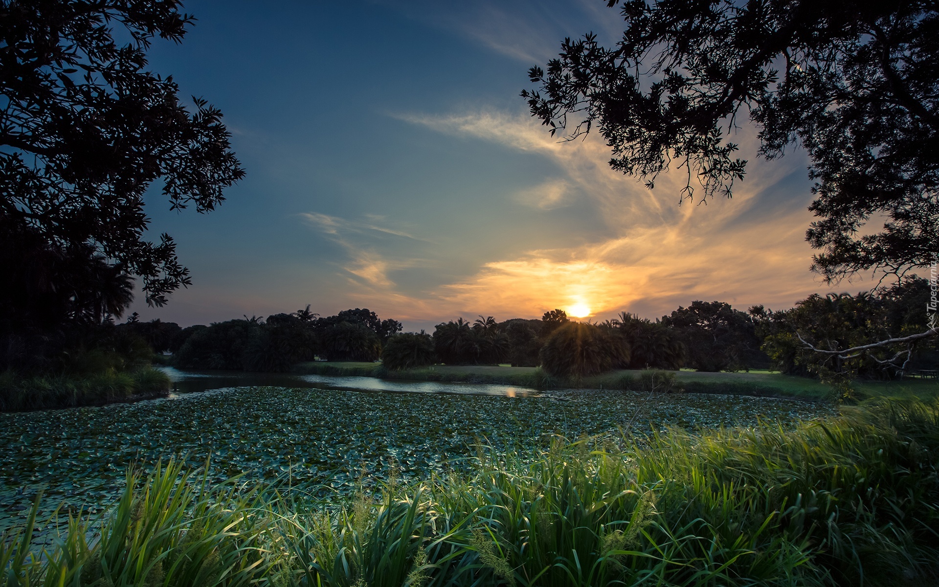 Edytor tapety: Zachód słońca, Park, Drzewa, Trawa