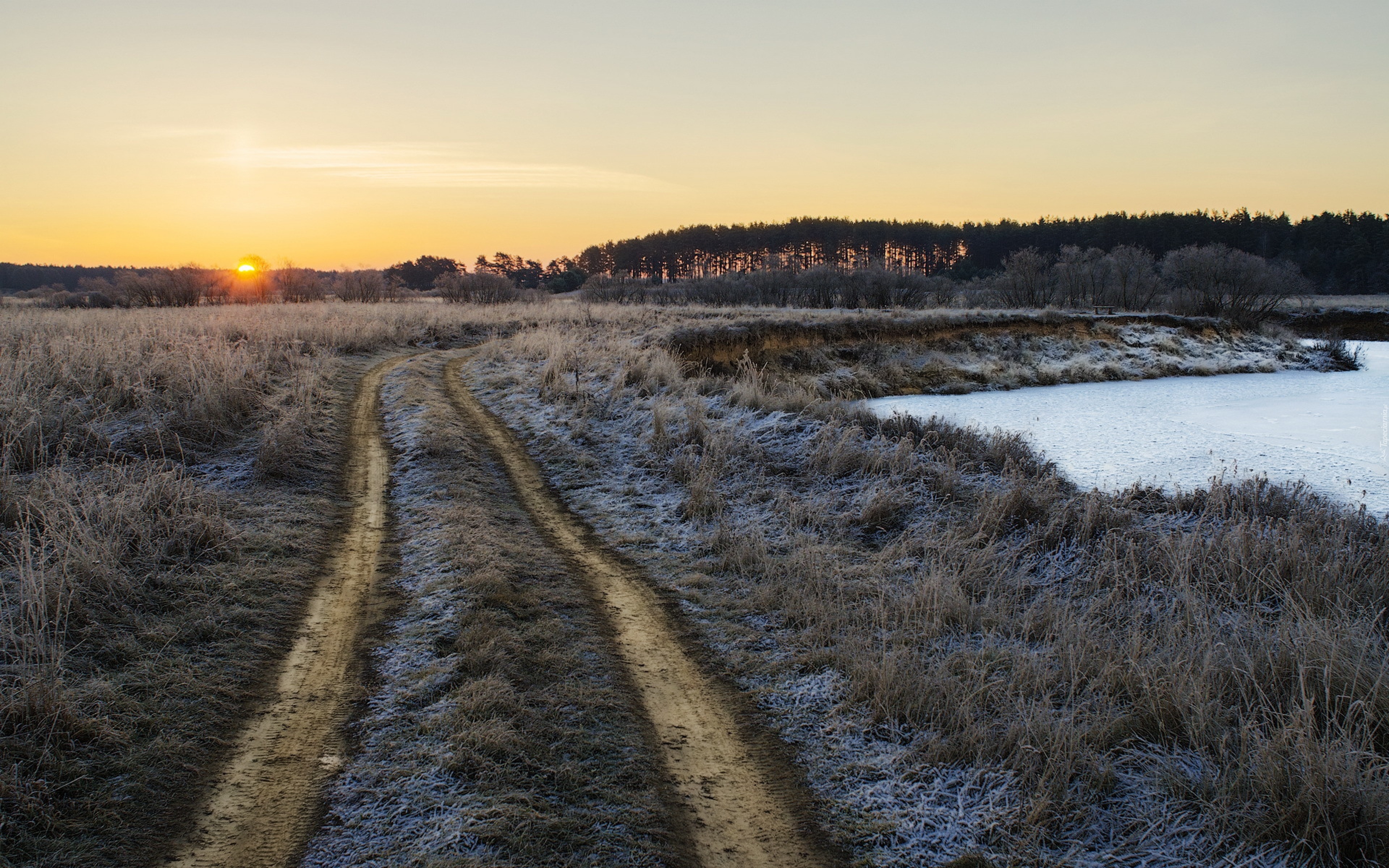 Edytor tapety: Wschód, Słońca, Jezioro, Droga, Zeschłe, Trawy