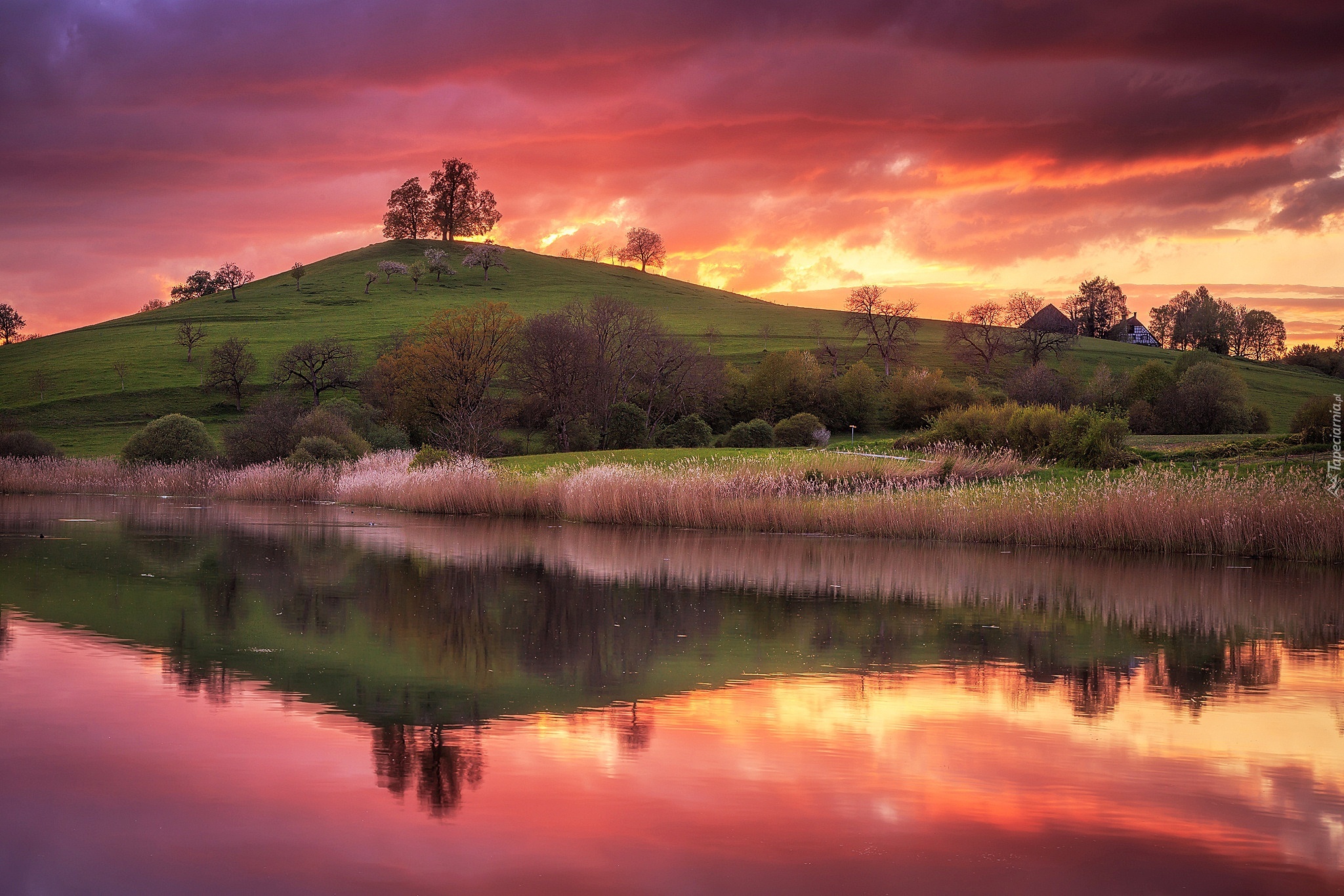 Edytor tapety: Rzeka, Wzgórza, Drzewa, Roślinność, Zachód, Słońca, Odbicie