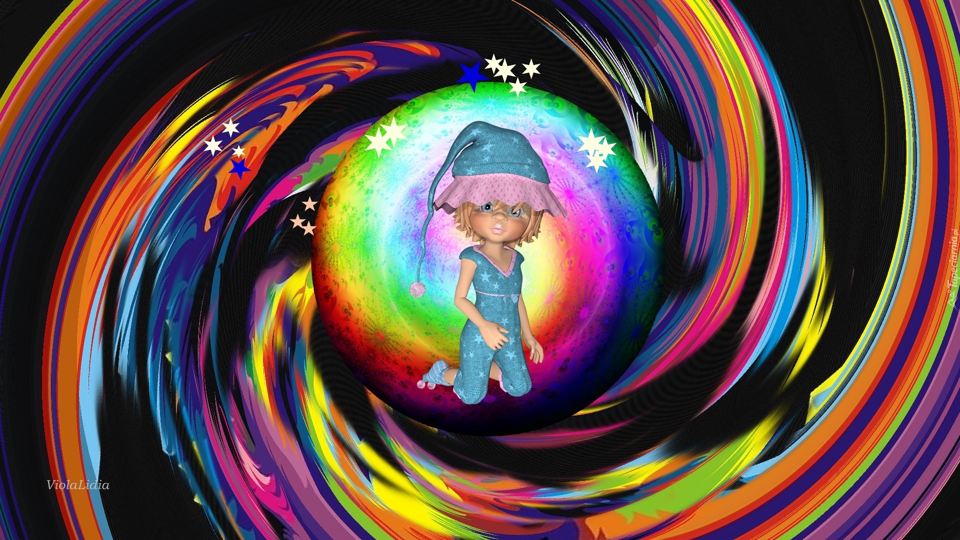 Edytor tapety: Grafika, Kolorowy, Księżyc, Gwiazdy, Laleczka