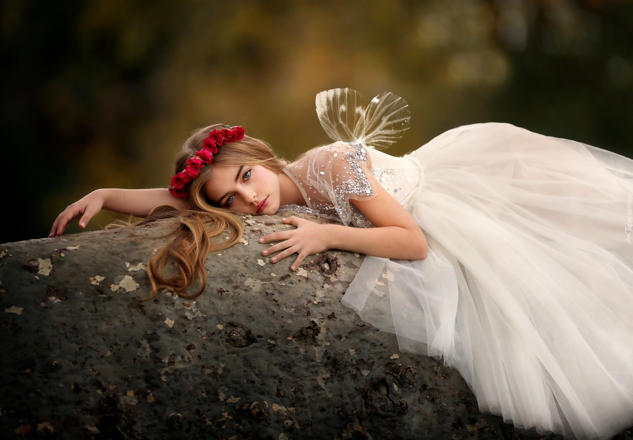Edytor tapety: Kobieta, Leżąca, Biała, Sukienka, Wianek