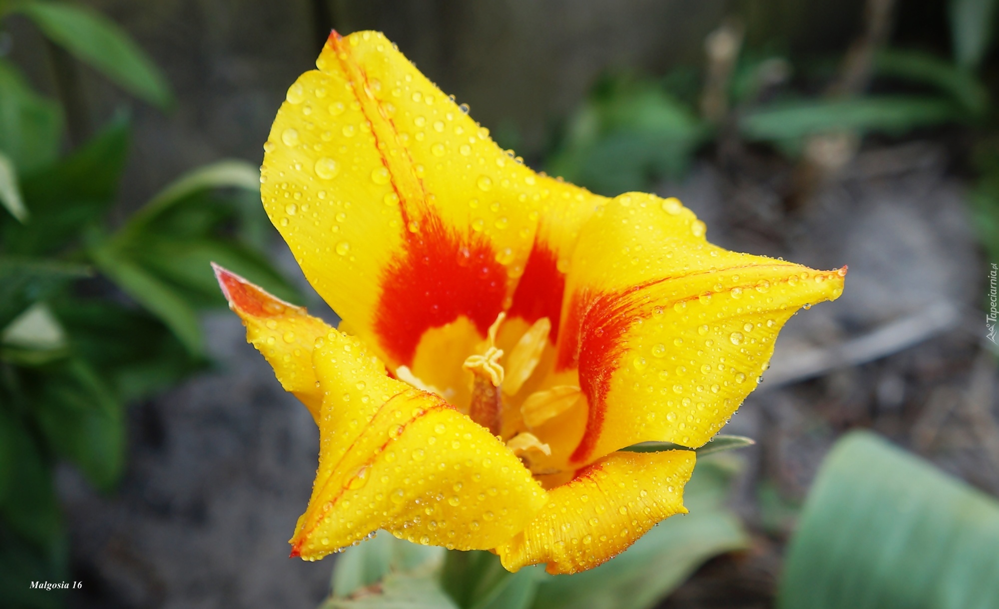 Edytor tapety: Kwiat, Żółty, Czerwony, Tulipan, Krople, Rosa
