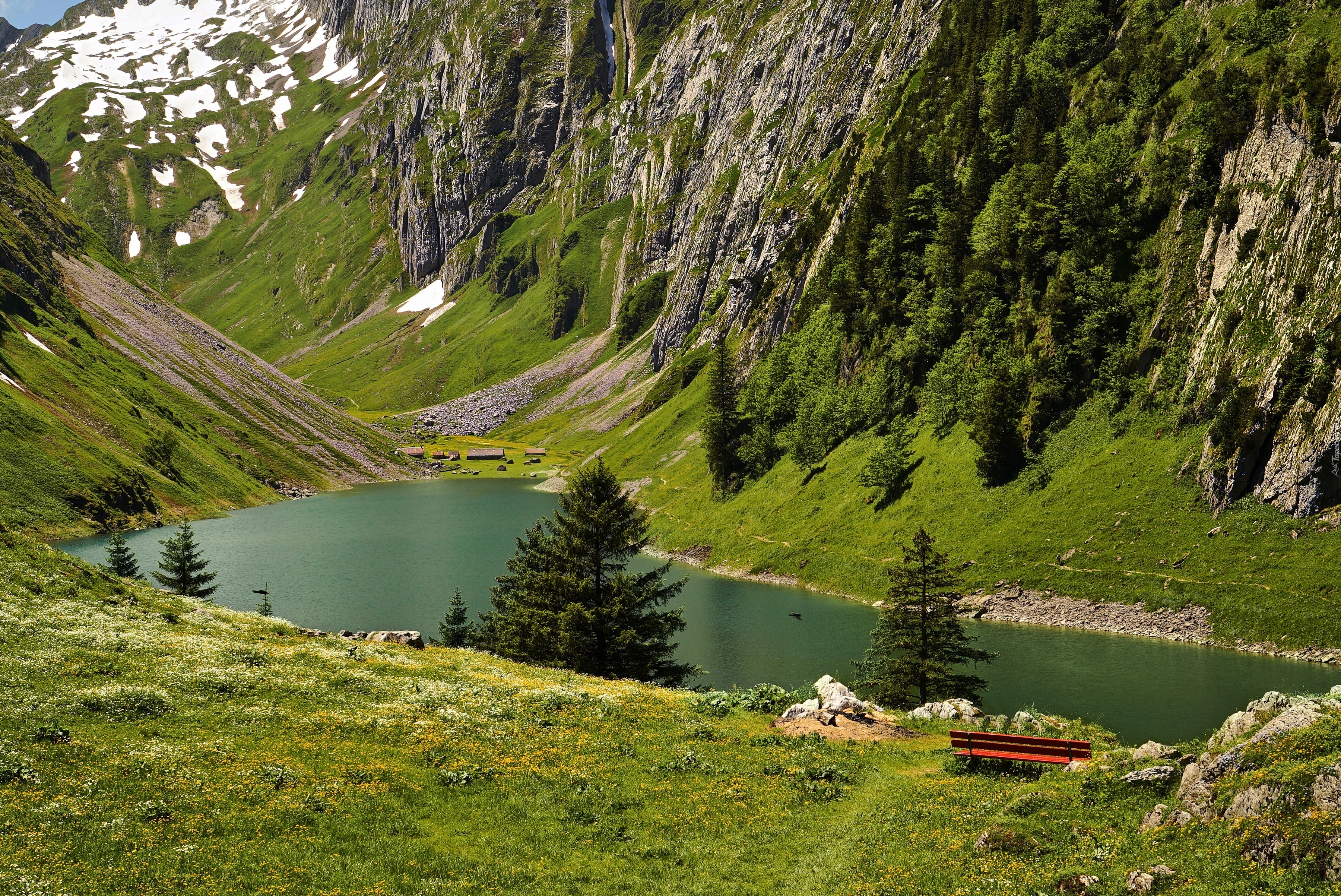 Edytor tapety: Góry, Jezioro, Ławka, Szwajcaria