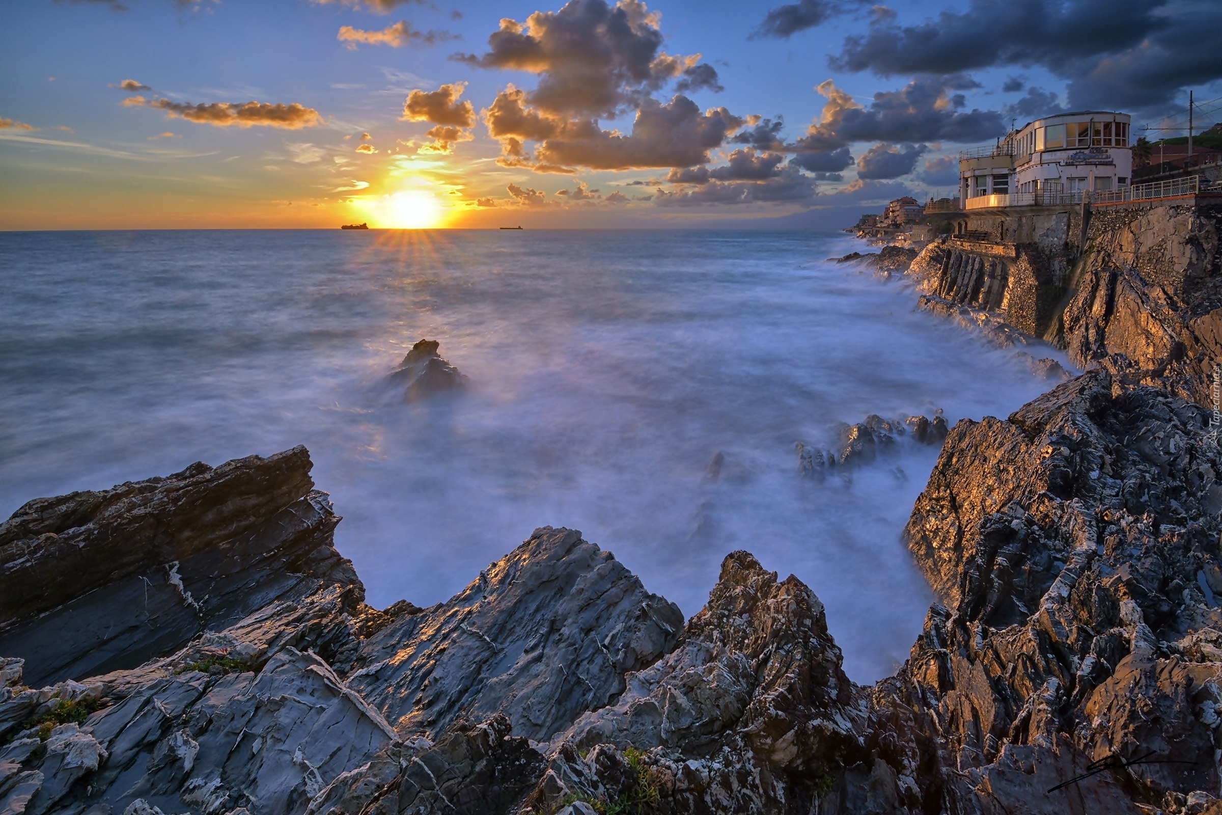 Edytor tapety: Hotel, Morze, Skały, Zachód Słońca