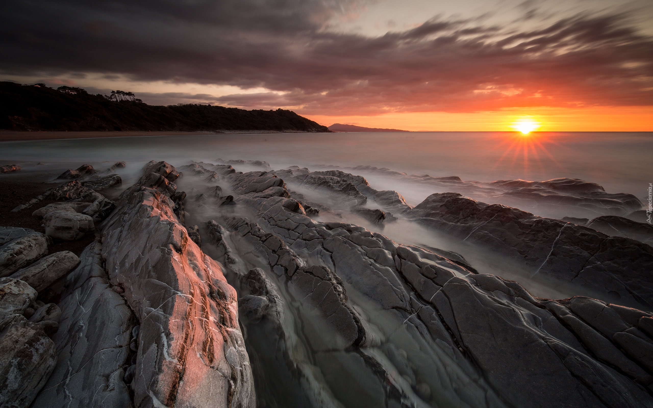 Edytor tapety: Morze, Zachód słońca, Kamienie, Chmury, Drzewa