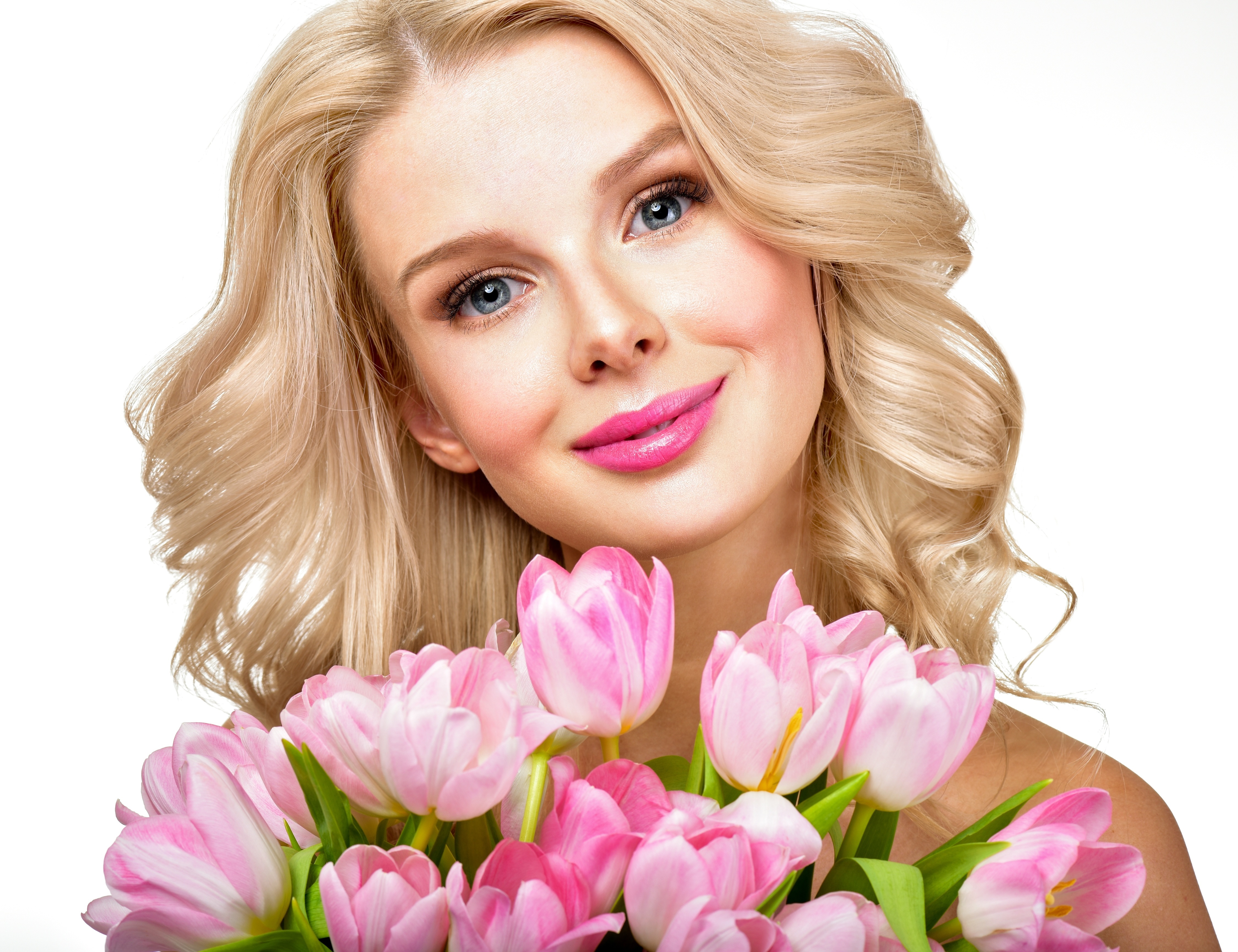 Edytor tapety: Uśmiechnięta, Kobieta, Makijaż, Tulipany
