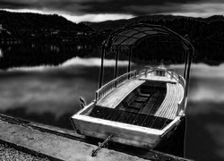 Edytor tapety: Jezioro, Bled, Wyspa, Kościół, Łódka, Zmierzch, Słowenia