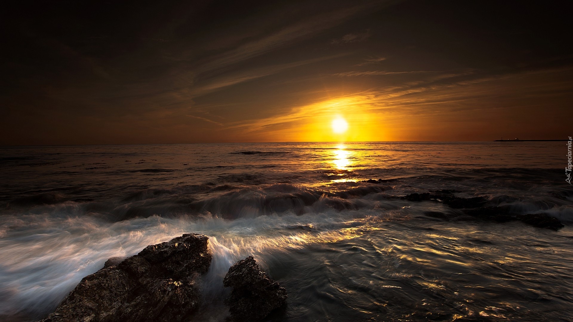 Edytor tapety: Morze, Zachód słońca, Kamienie