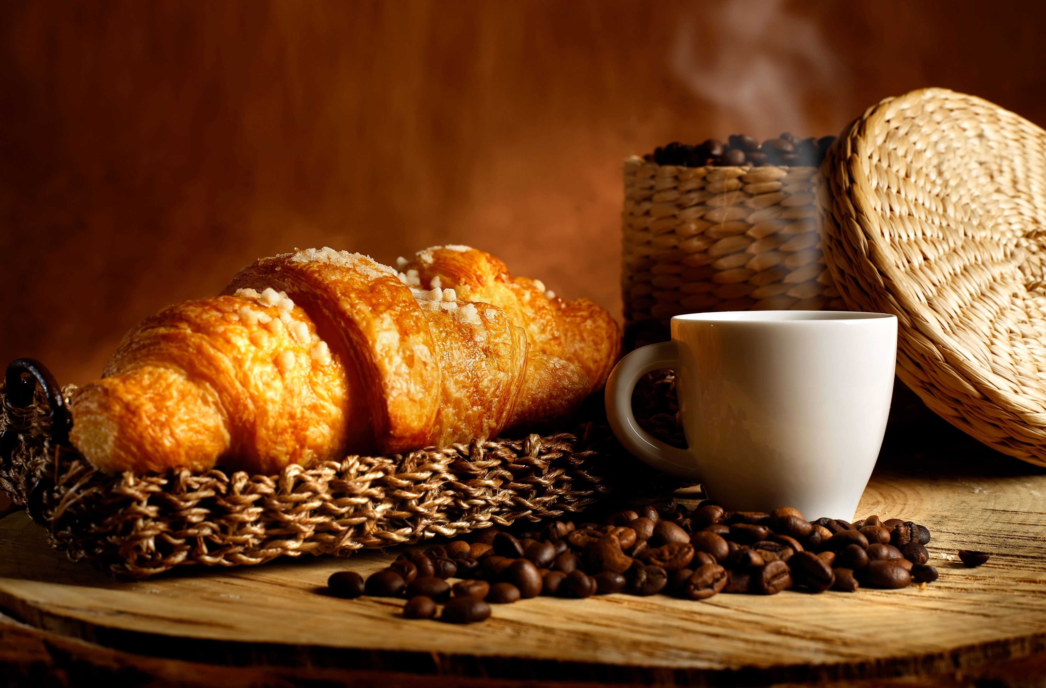 Edytor tapety: Kawa, Filiżanka, Stół, Rogal