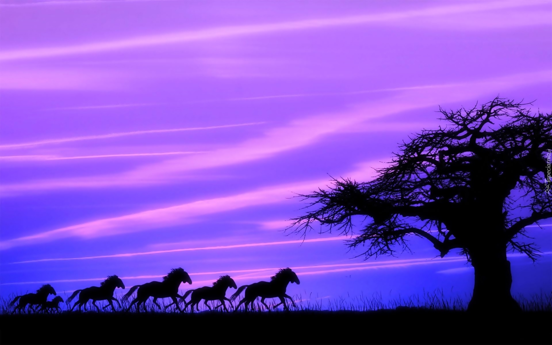 Edytor tapety: Stado, Koni, Drzewo, Wschód, Słońca