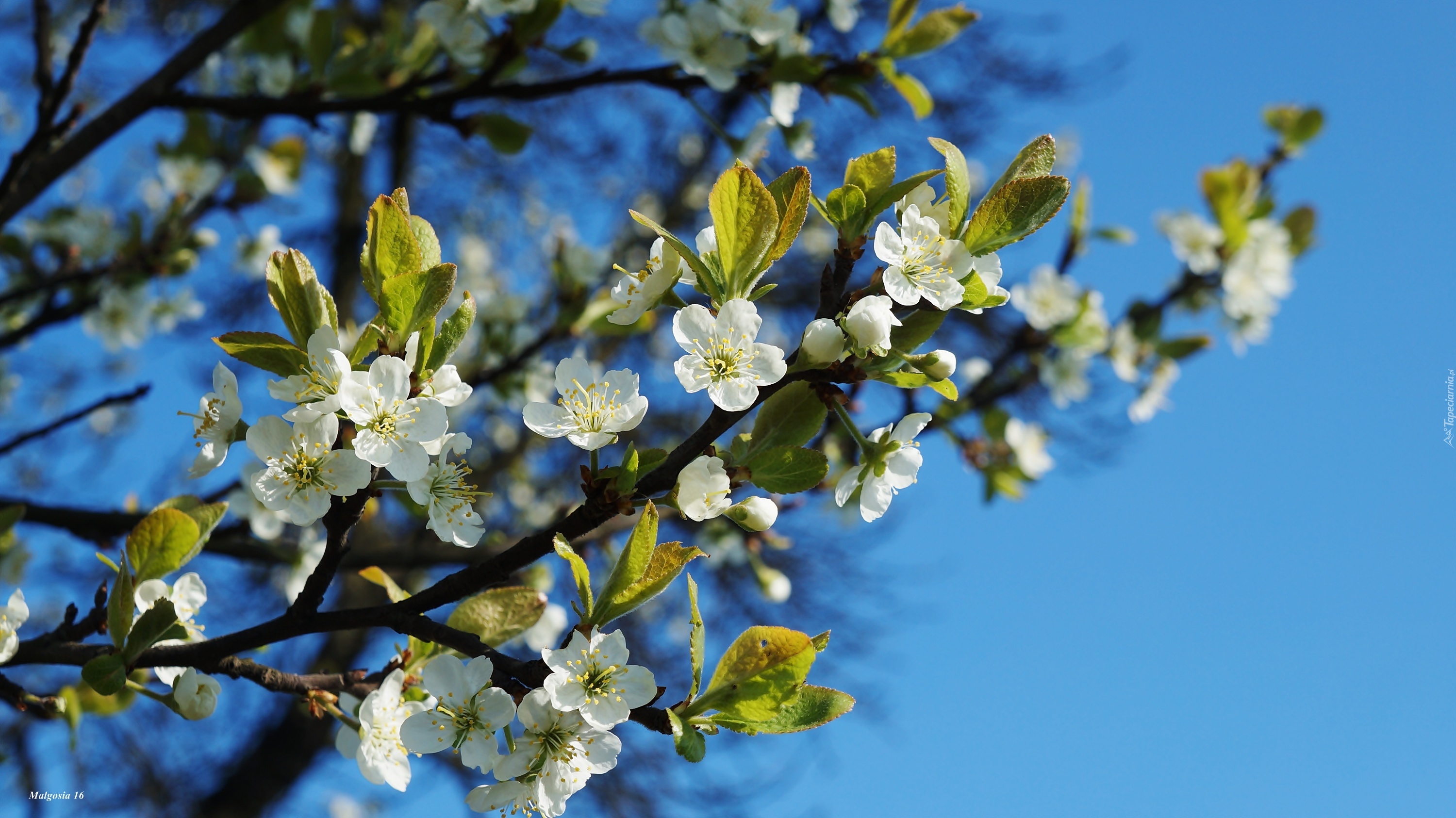 Edytor tapety: Białe, Kwiaty, Gałązka, Drzewo, Owocowe, Niebieskie, Niebo