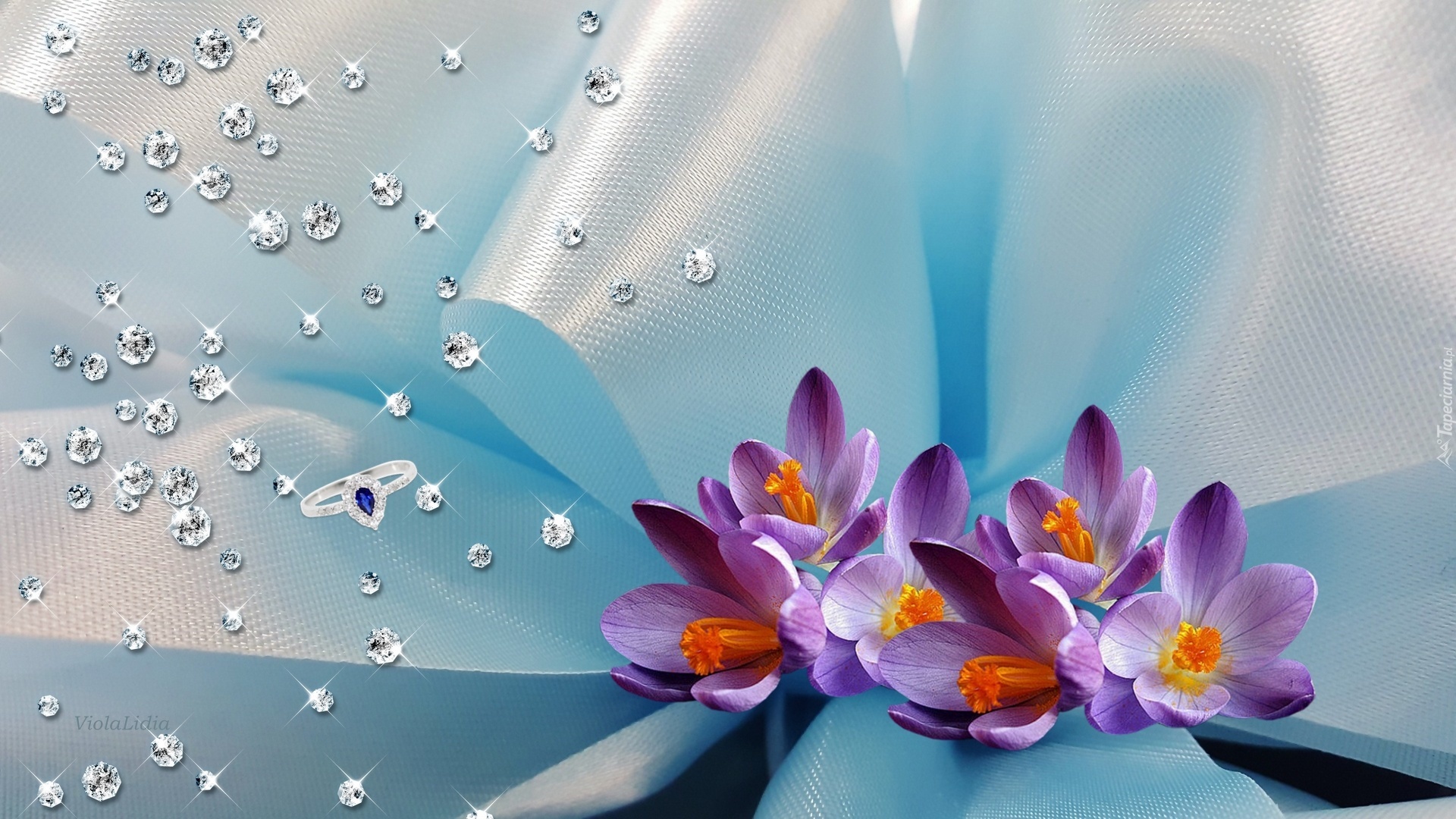 Edytor tapety: Grafika, Zaręczyny, Biżuteria, Pierścionek, Diamenty, Kwiaty, Krokusy, Kokarda