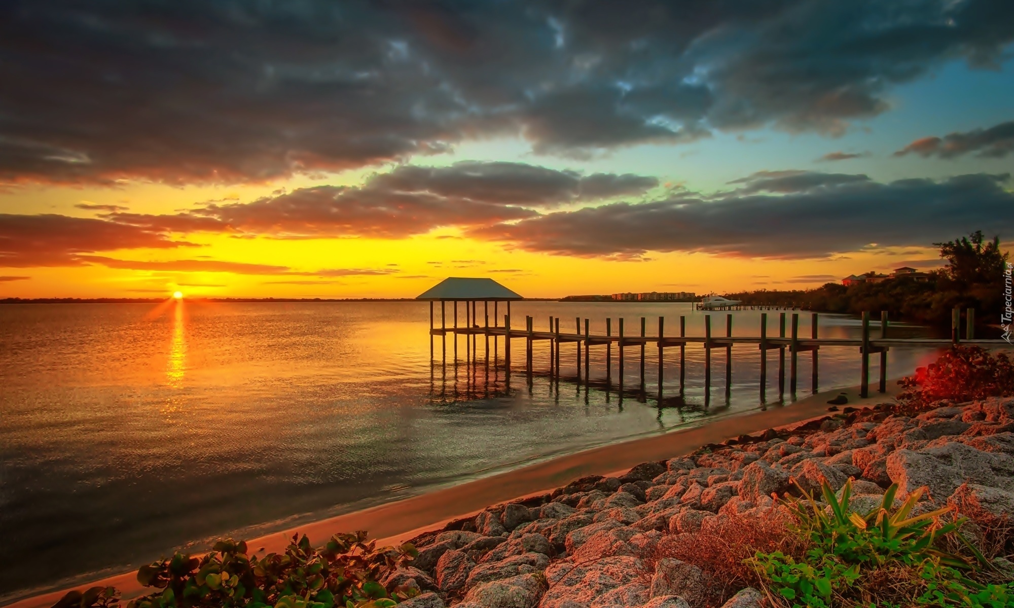 Edytor tapety: Jezioro, Molo, Łódka, Zachód, Słońca