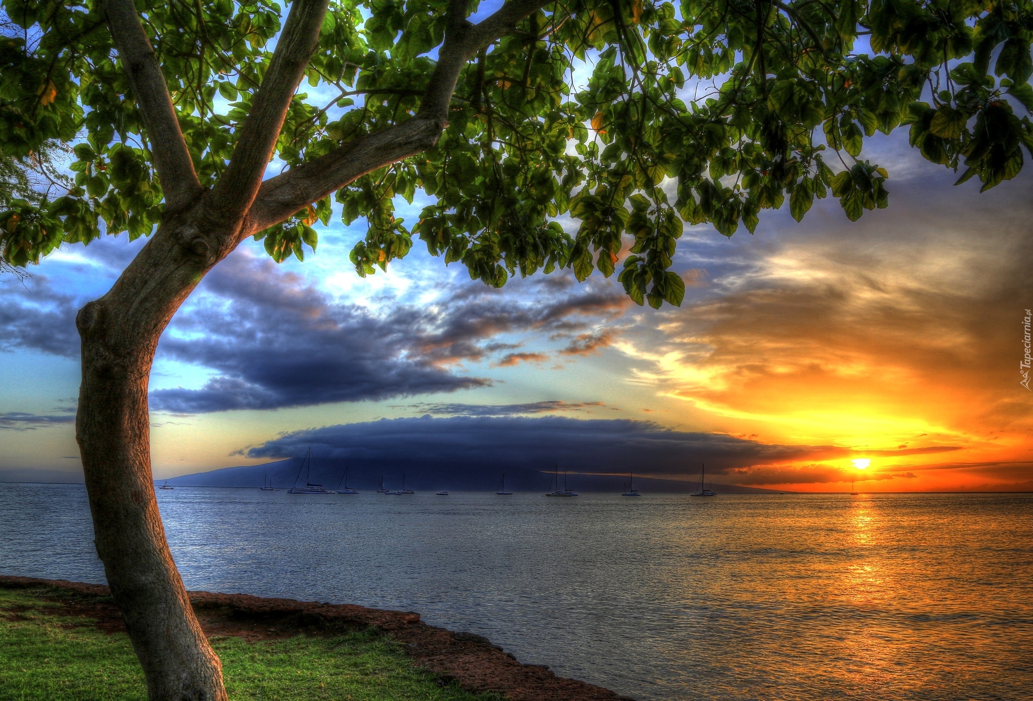 Edytor tapety: Morze, Drzewo, Żaglówki, Zachód, Słońca