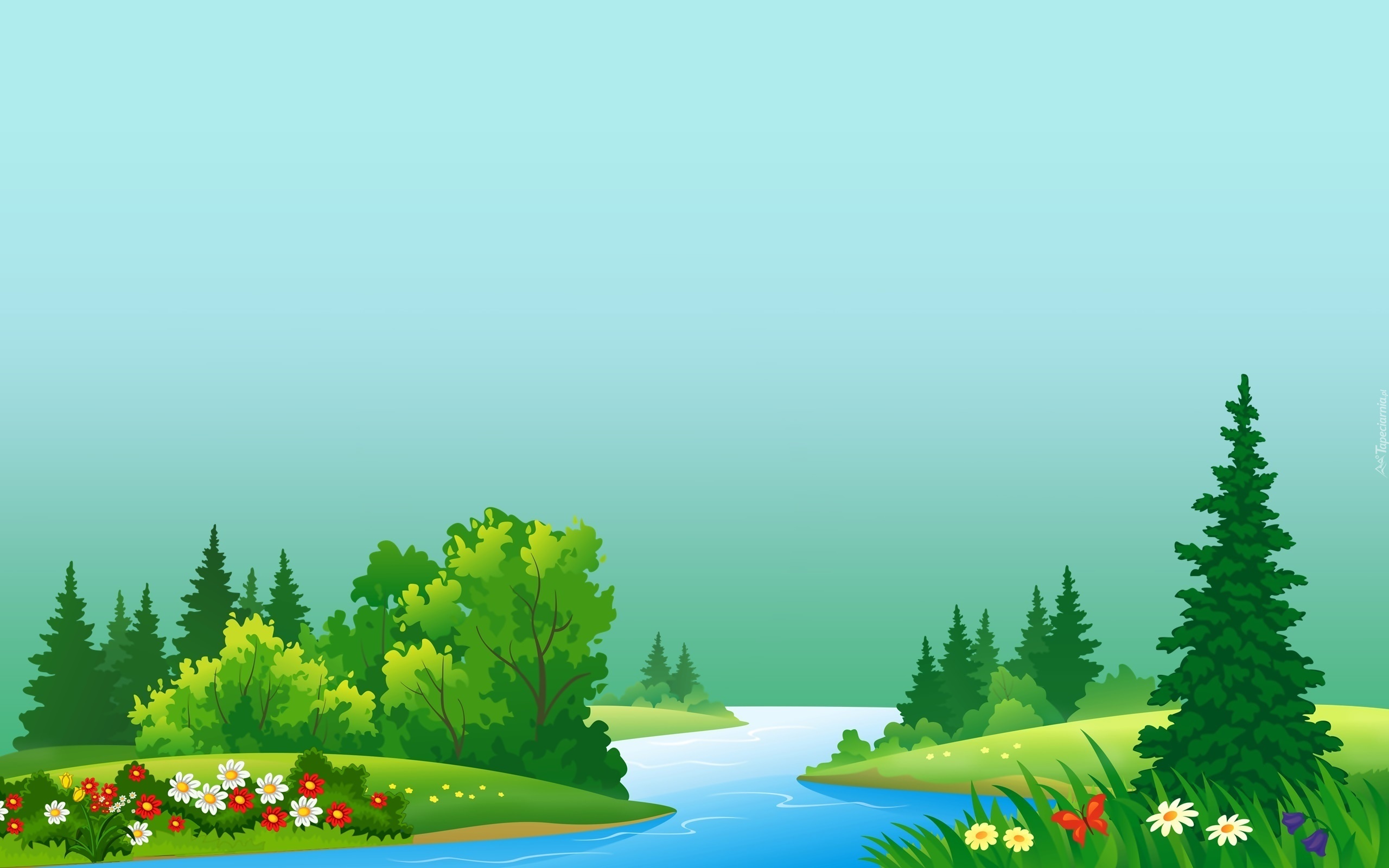 Edytor tapety: Rzeka, Łąka, Drzewa, Kwiaty