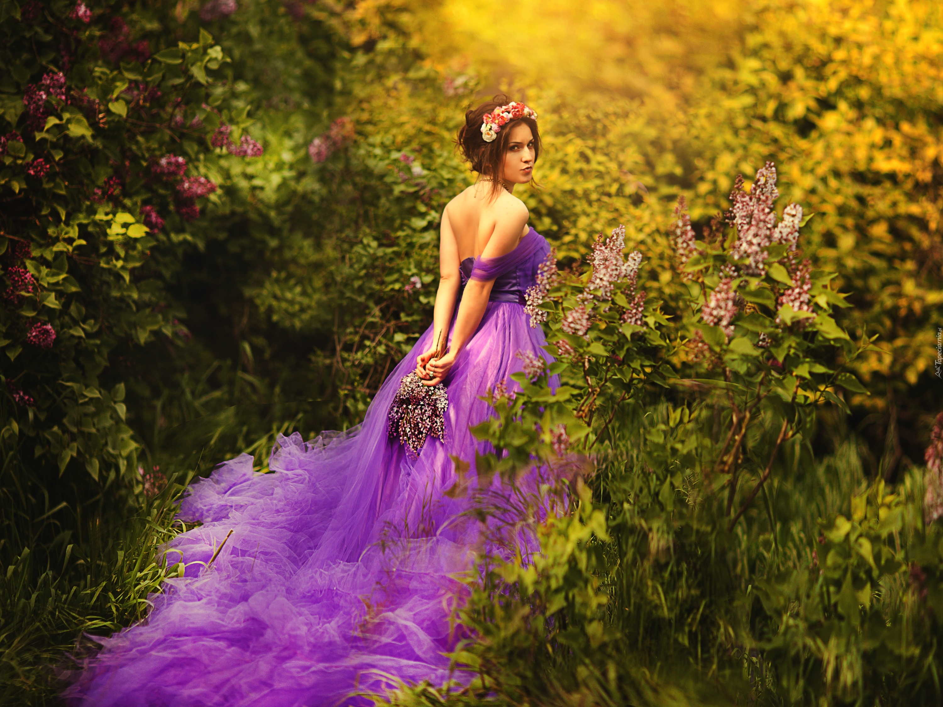Edytor tapety: Las, Kobieta, Fioletowa, Suknia, Polne, Kwiaty