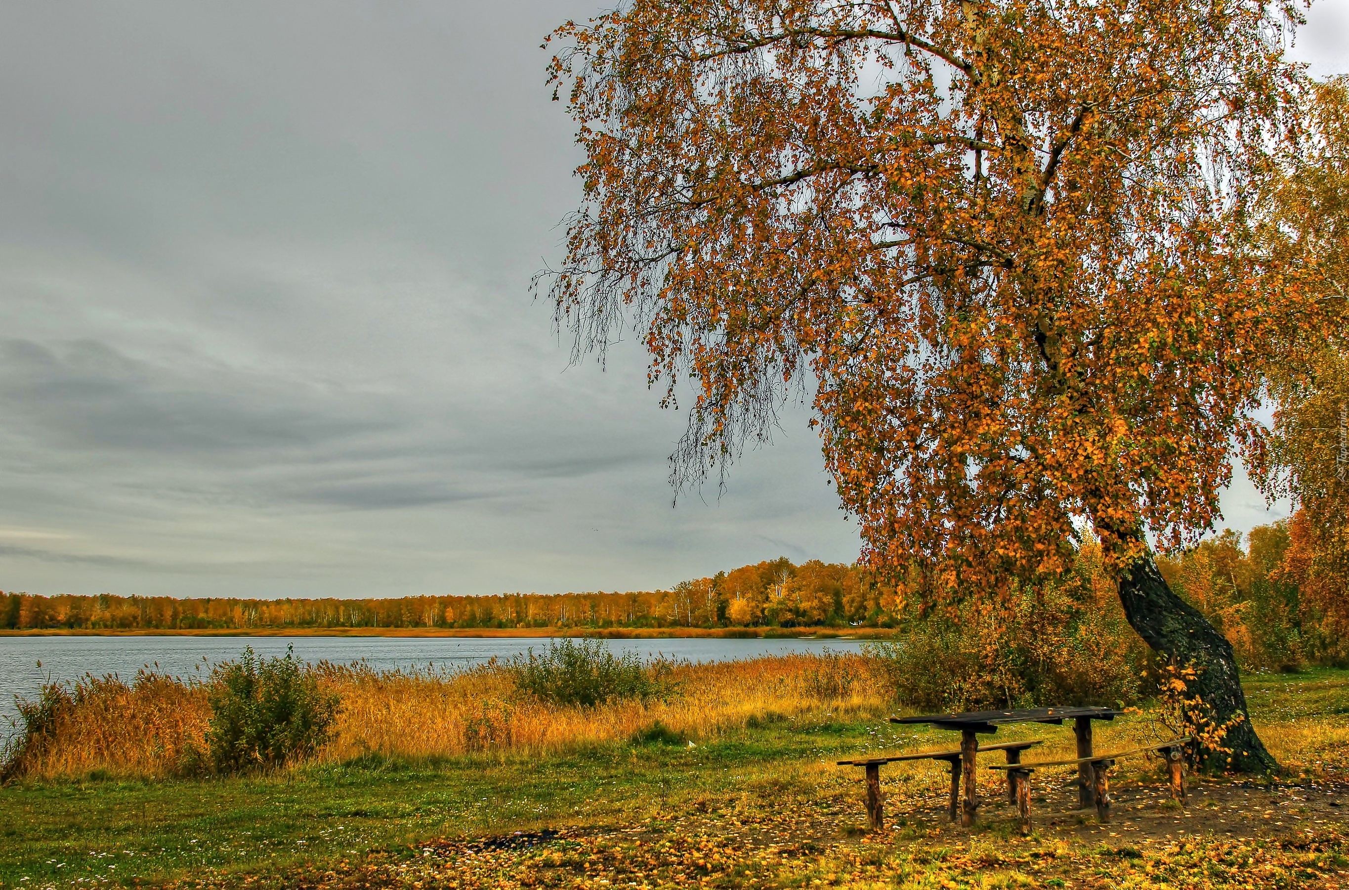 Edytor tapety: Jesień, Las, Jezioro, Ławeczki