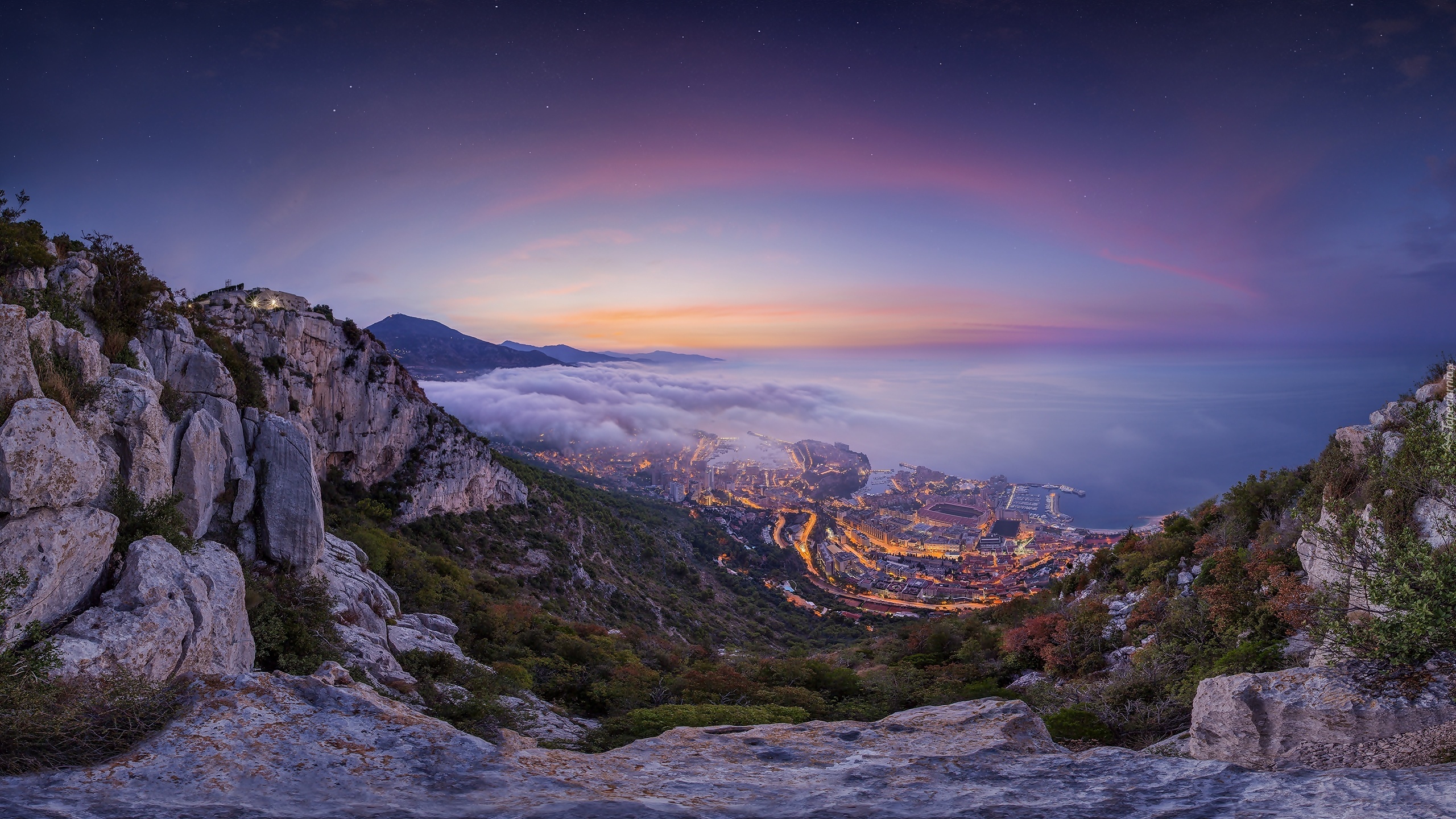 Edytor tapety: Góry, Skały, Miasteczko, Mgła