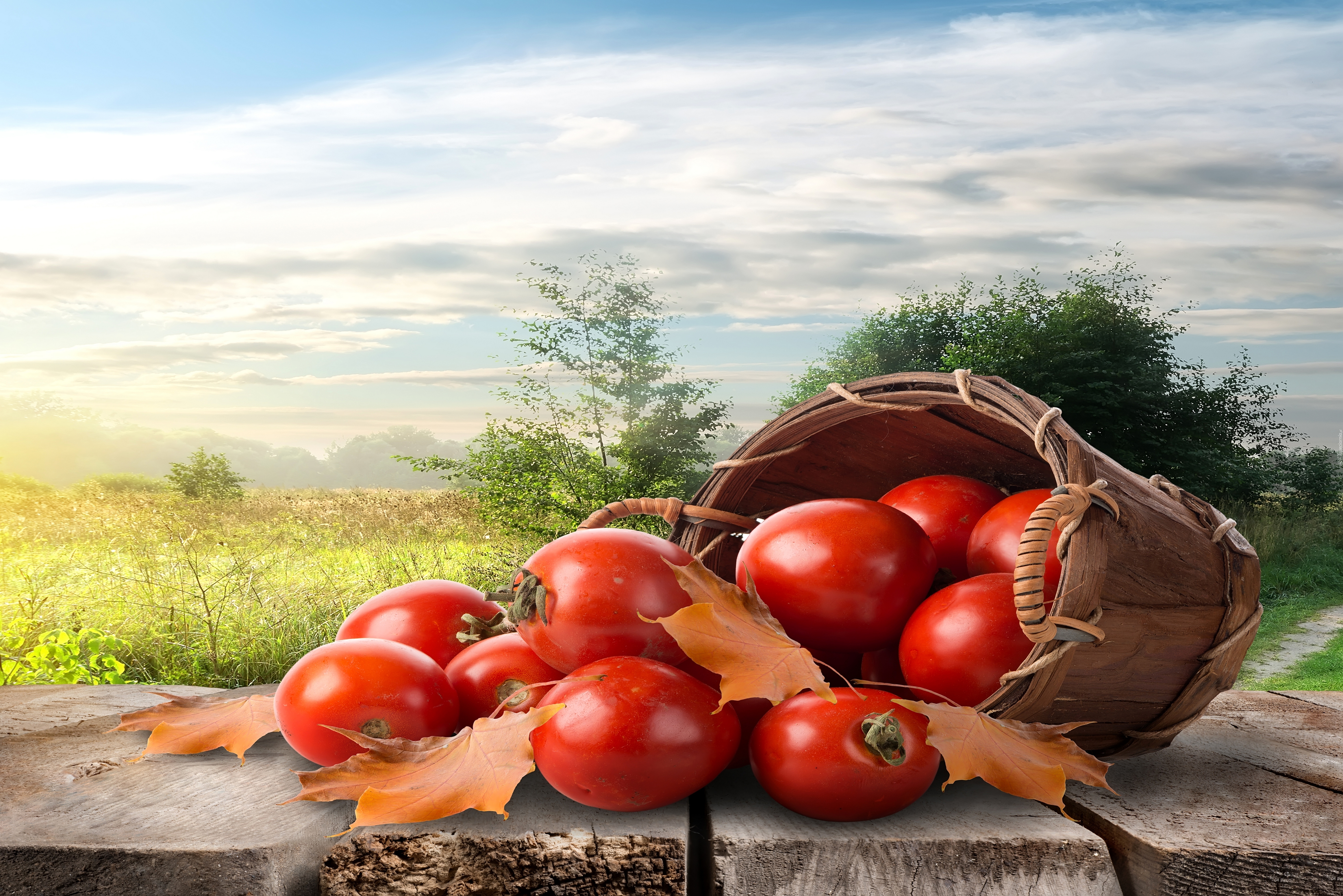 Edytor tapety: Jesień, Pomidory, Zeschnięte, Liście, Koszyk, Łąka