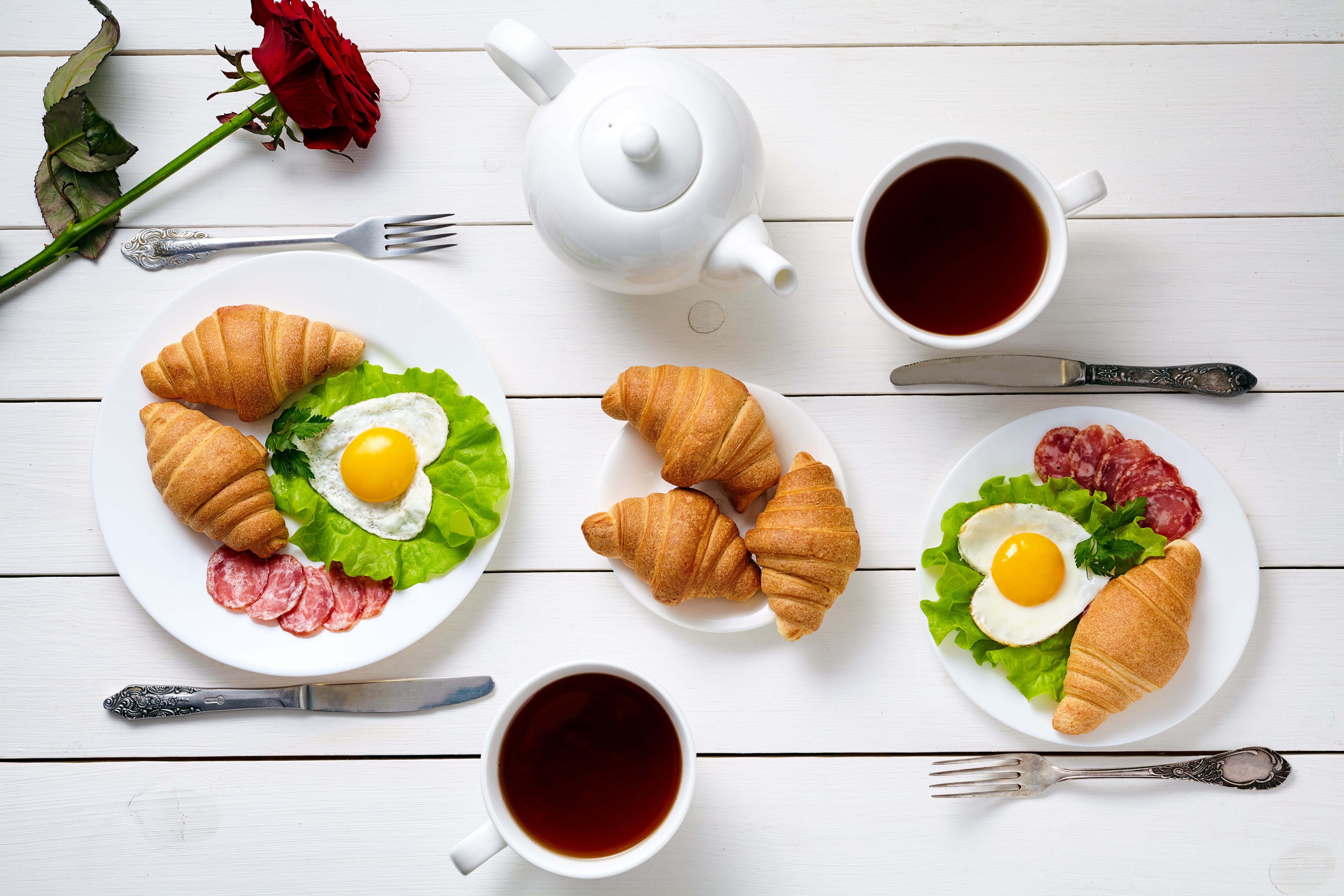 Edytor tapety: Śniadanie, Rogaliki, Herbata, Jajka, Róża