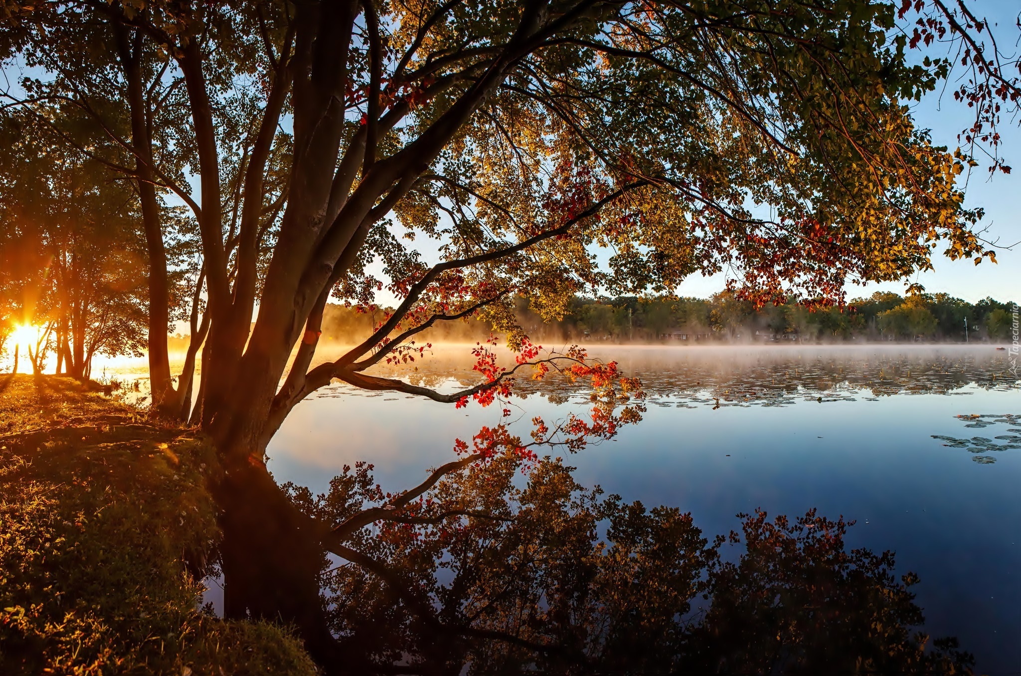 Edytor tapety: Jezioro, Las, Mgła, Przebijające, Światło, Drzewa