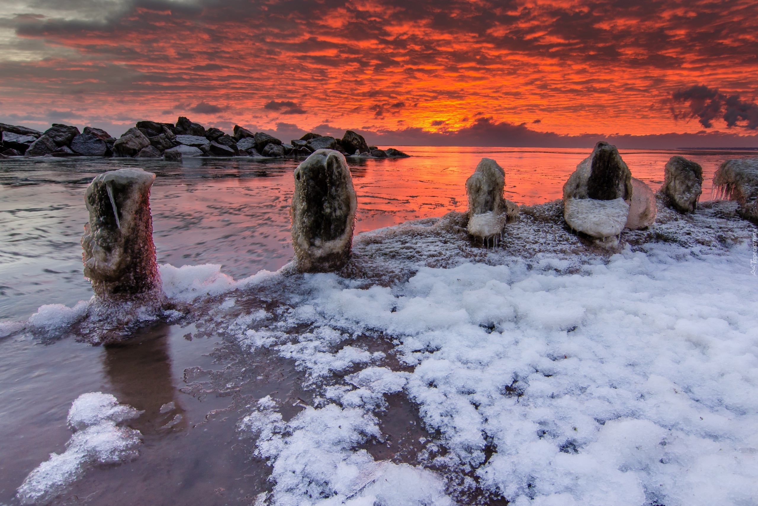 Edytor tapety: Zima, Morze, Zachód, Słońca, Pale