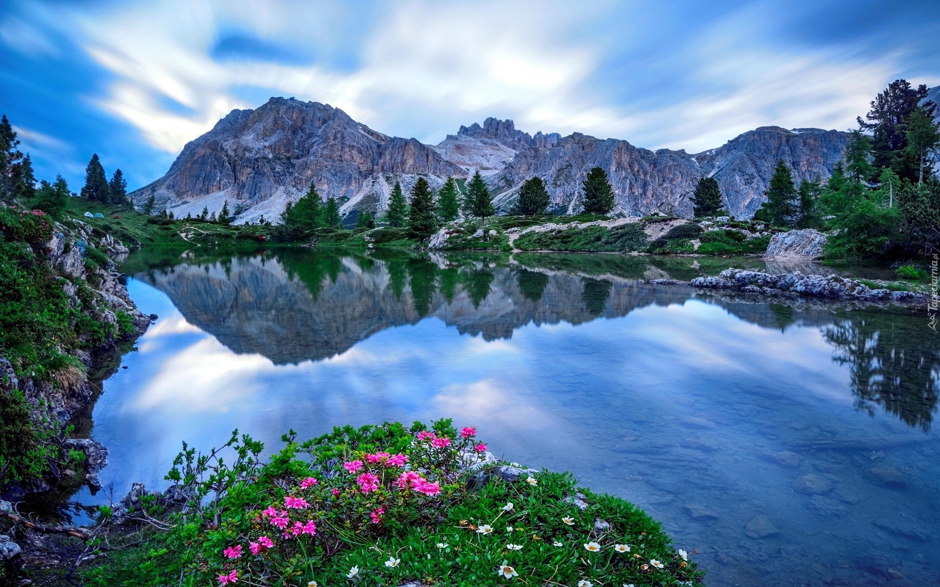 Edytor tapety: Góry, Jezioro, Drzewa, Różowe, Kwiaty, Odbicie