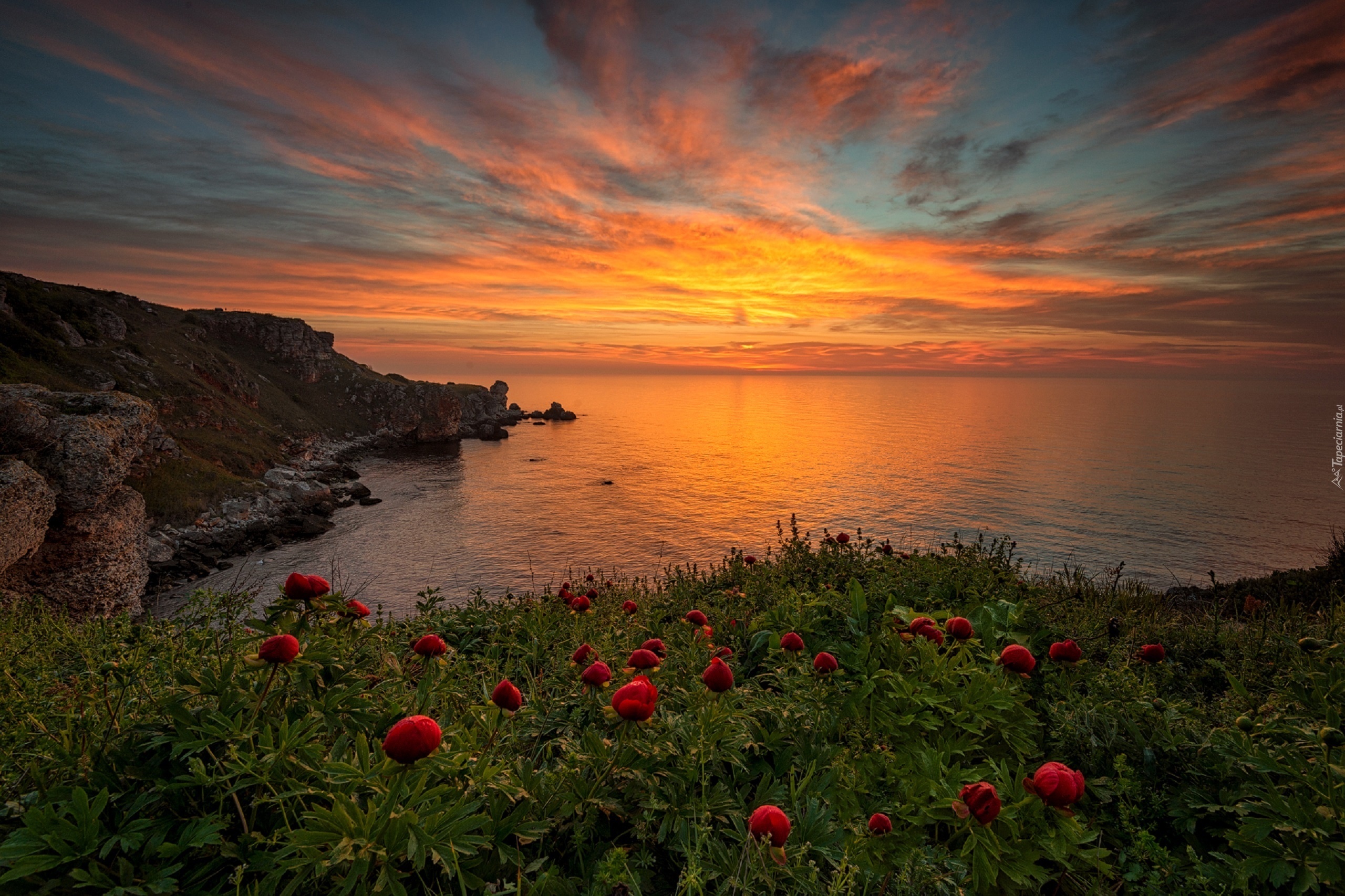 Edytor tapety: Bułgaria, Zachód słońca, Morze Czarne, Wybrzeże, Kwiaty, Piwonie