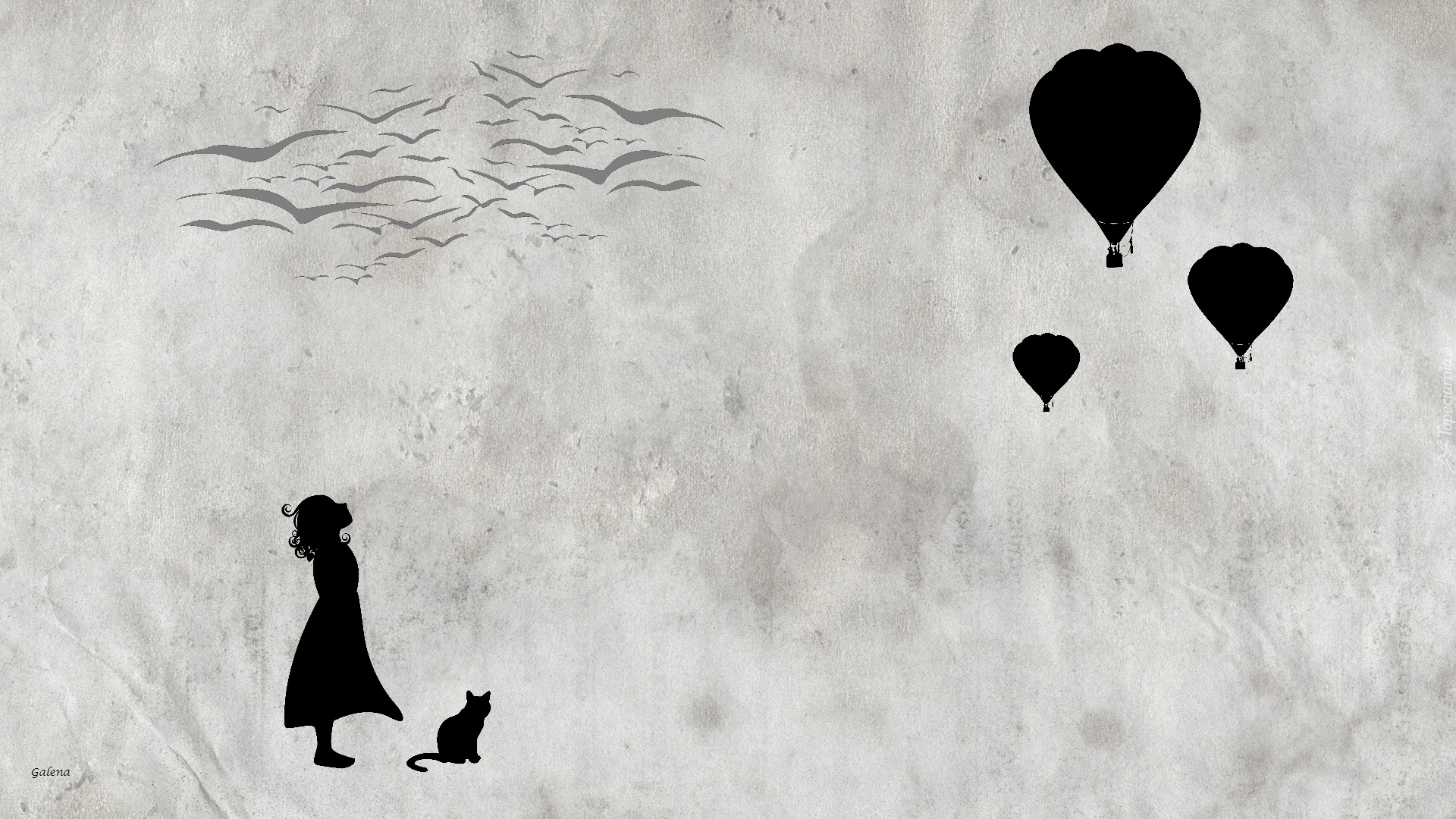 Edytor tapety: Dziewczynka, Balony, Kot, Ptaki, Grafika
