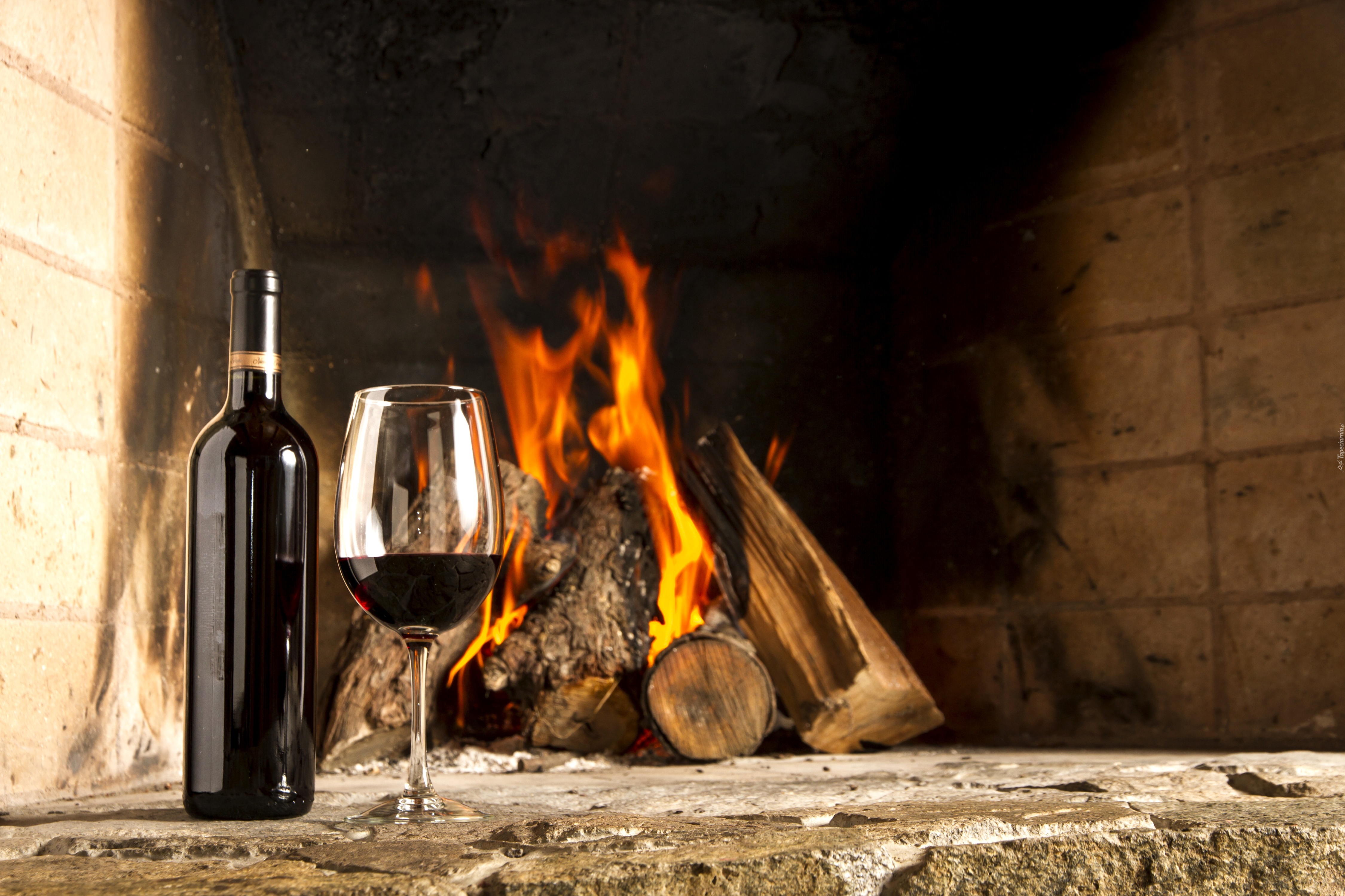Edytor tapety: Wino, Kieliszek, Kominek, Ogień