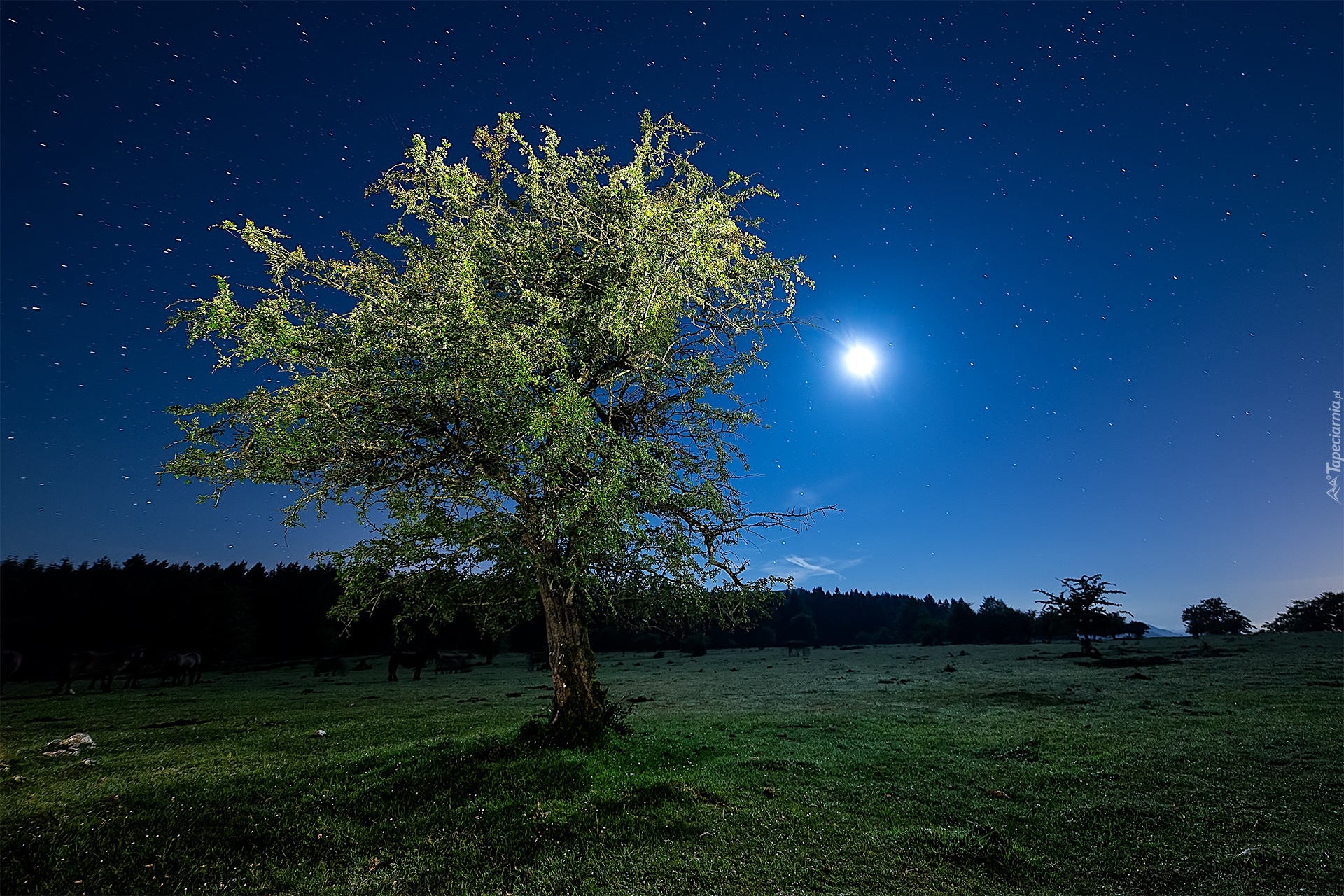 Edytor tapety: Noc, Księżyc, Gwiazdy, Drzewo, Łąka