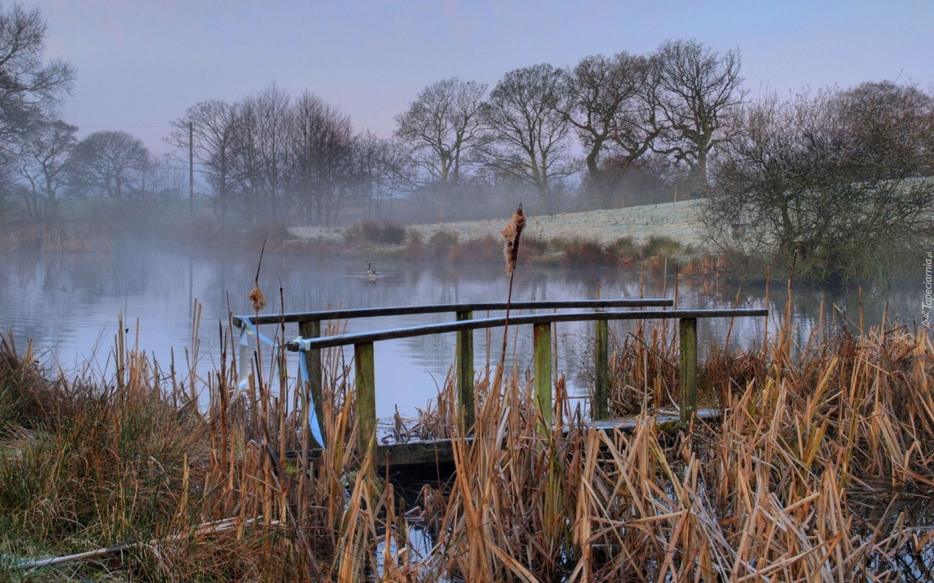 Edytor tapety: Mostek, Rzeka, Mgła, Drzewa