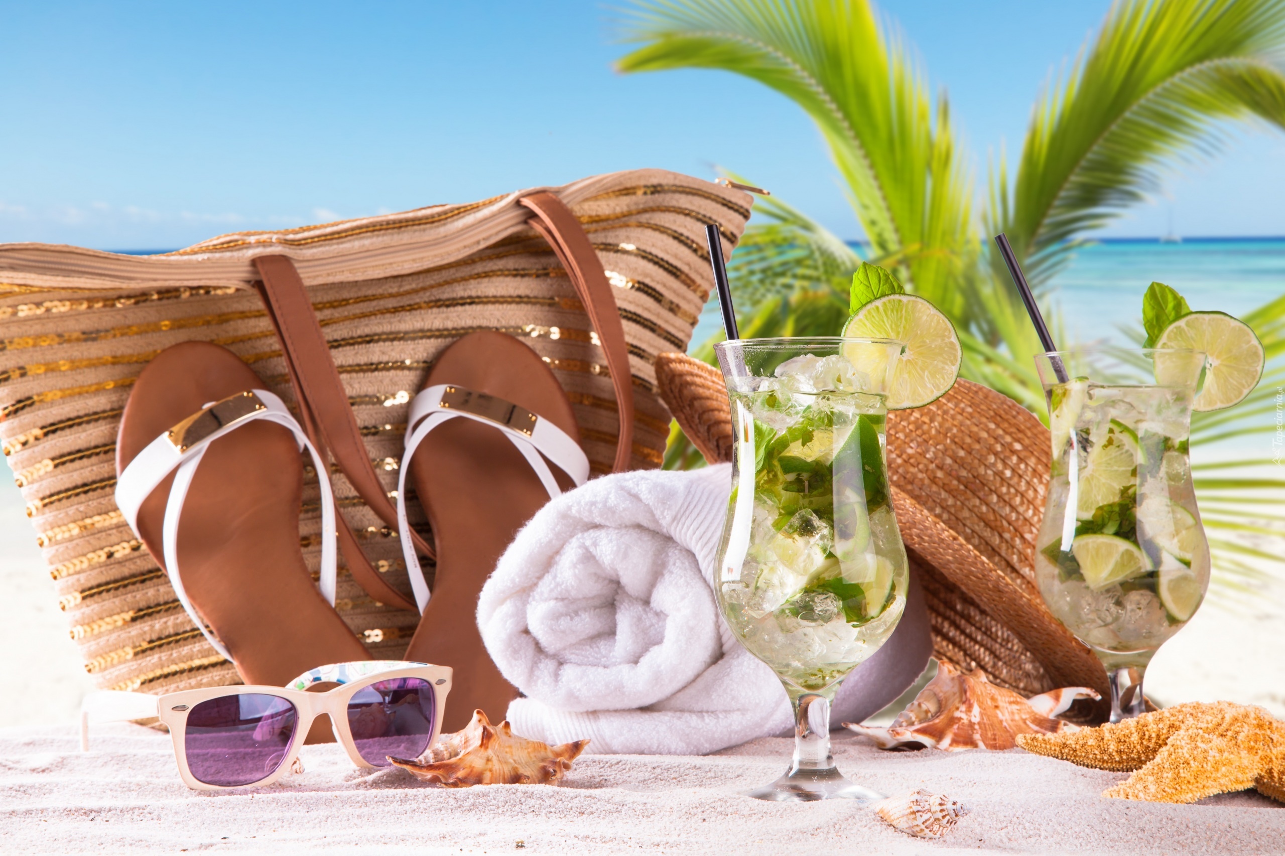 Edytor tapety: Kompozycja, Muszle, Plaża, Palma, Klapki, Okulary, Kapelusz, Wakacje
