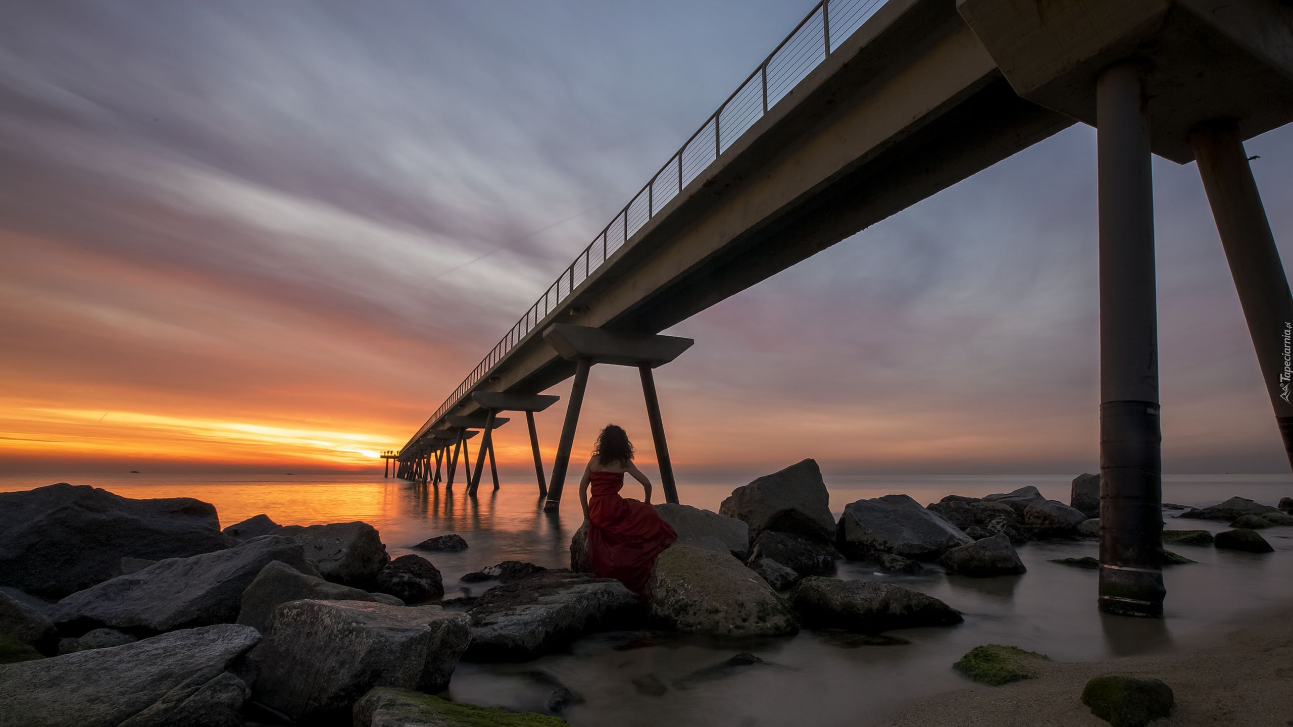 Edytor tapety: Morze, Kobieta, Kamienie, Molo, Zachód słońca, Skały