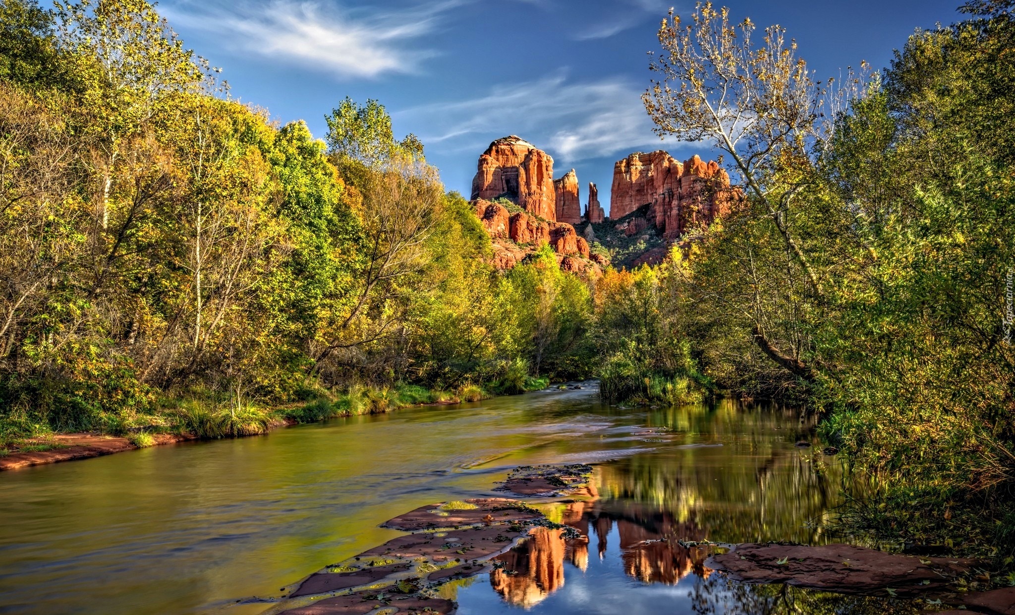 Edytor tapety: Rzeka, Drzewa, Skały, Odbicie