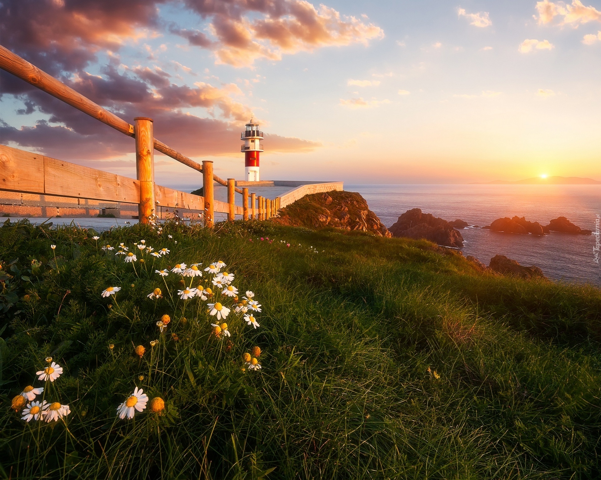 Edytor tapety: Morze, Zachód Słońca, Latarnia Morska, Kwiaty