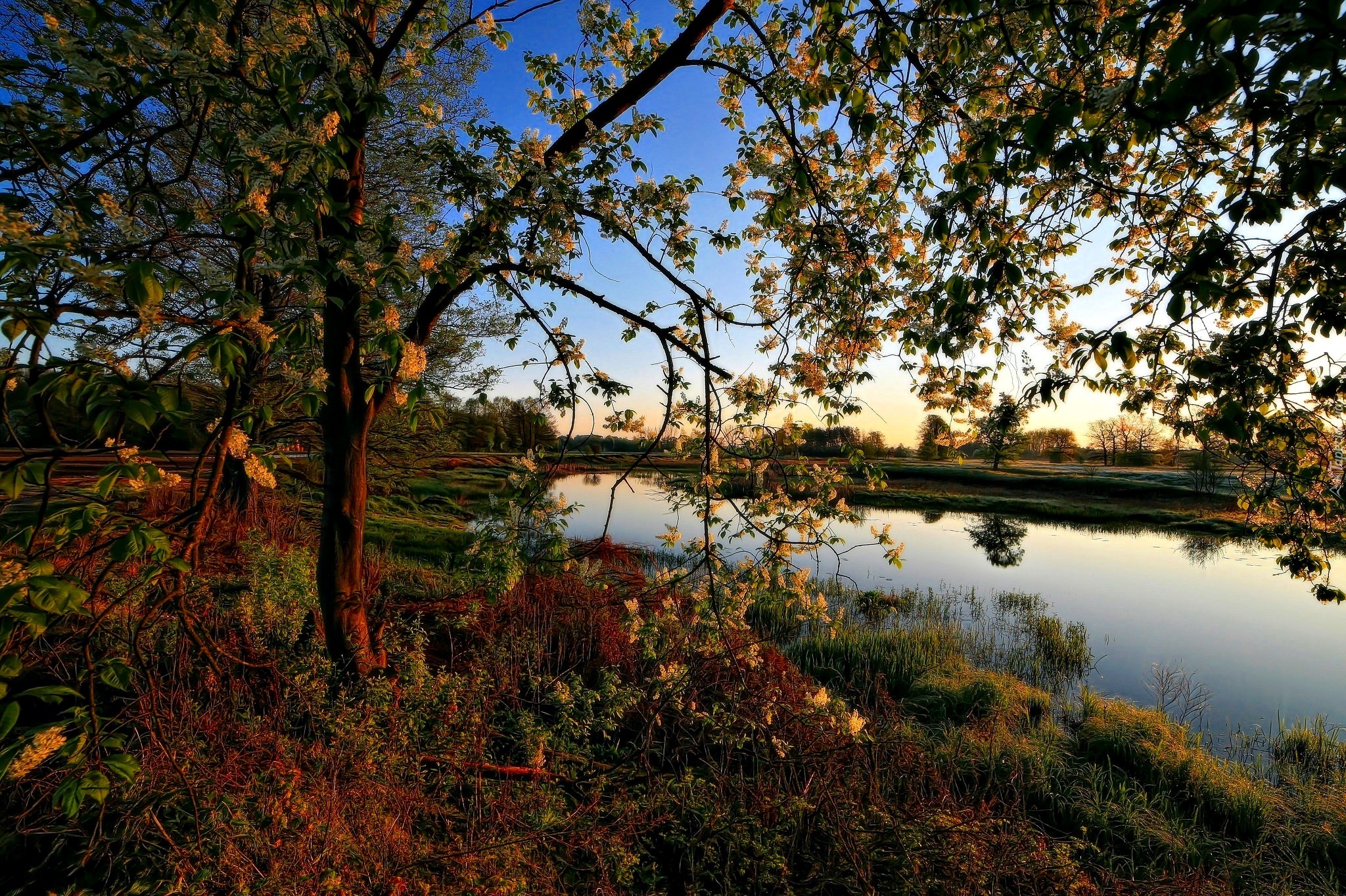 Edytor tapety: Kwitnące, Drzewo, Staw, Wiosna