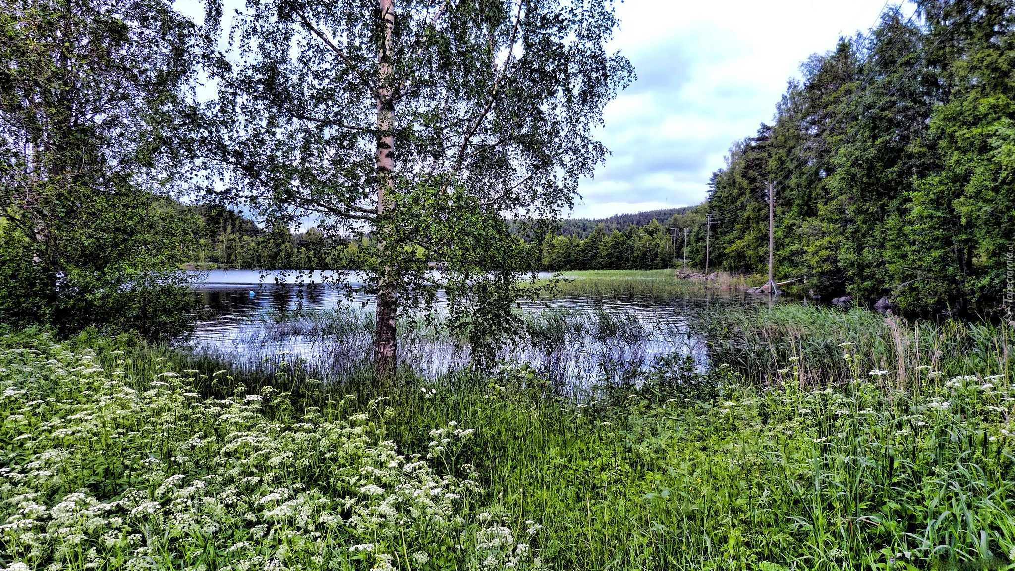 Edytor tapety: Jezioro, Białe, Kwiaty, Drzewa, Brzoza