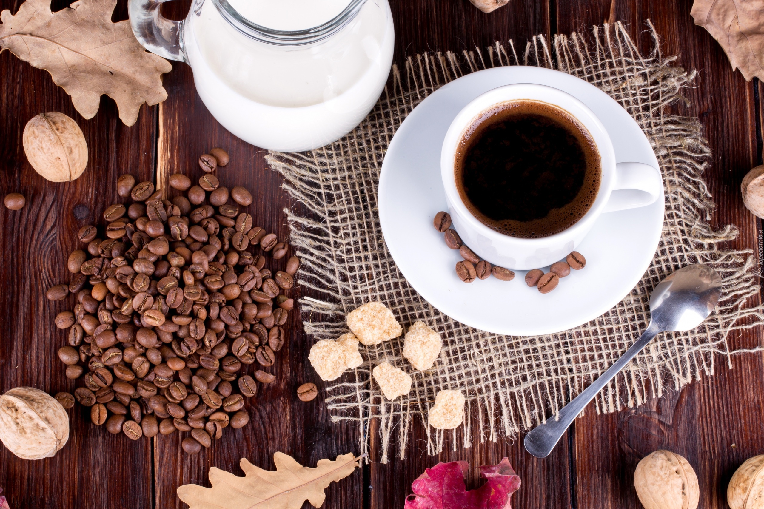 Edytor tapety: Deska, Orzechy, Łyżeczka, Serwetka, Liście, Kawa
