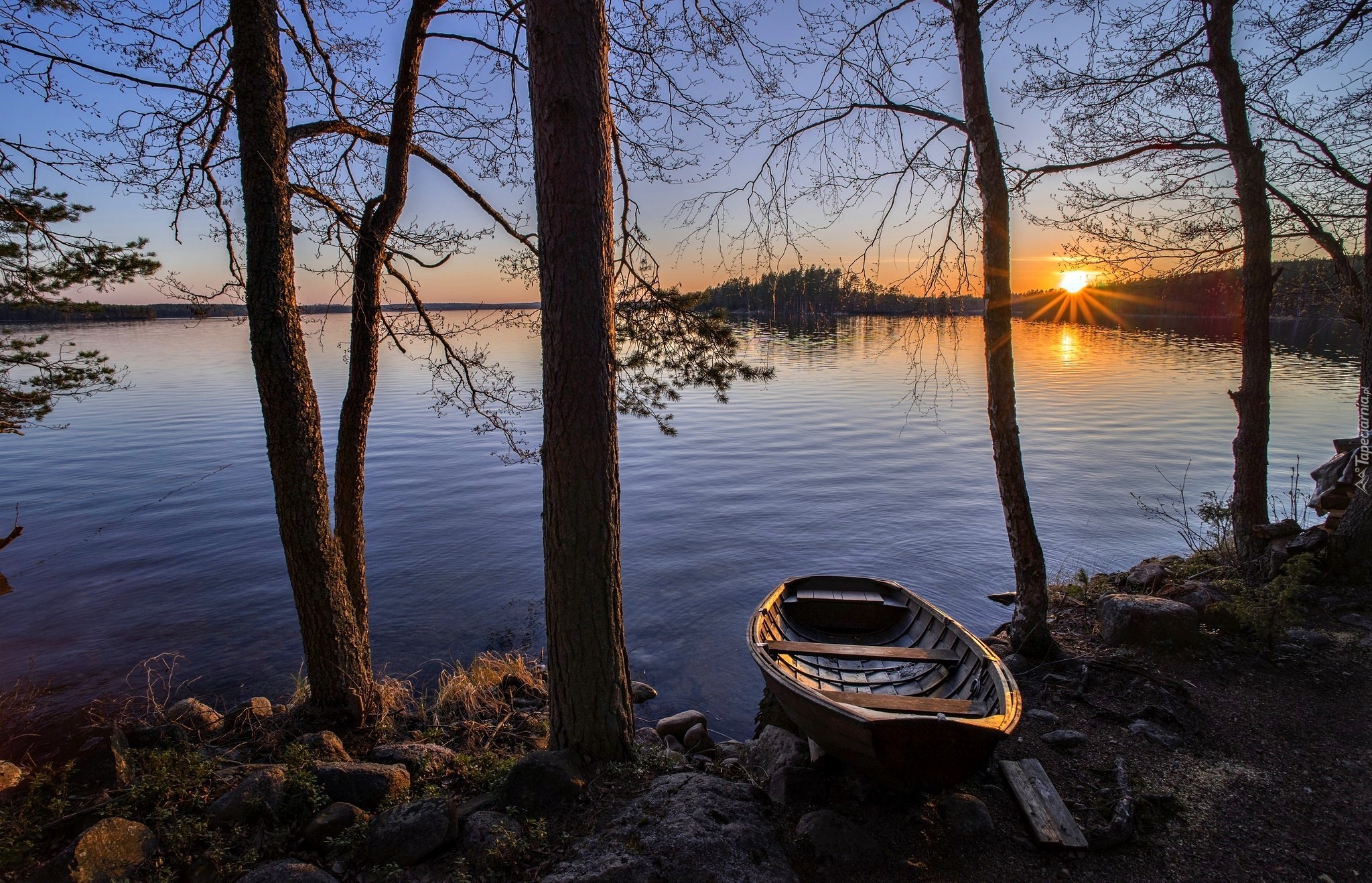 Edytor tapety: Drzewa, Łódka, Jezioro, Wschód Słońca