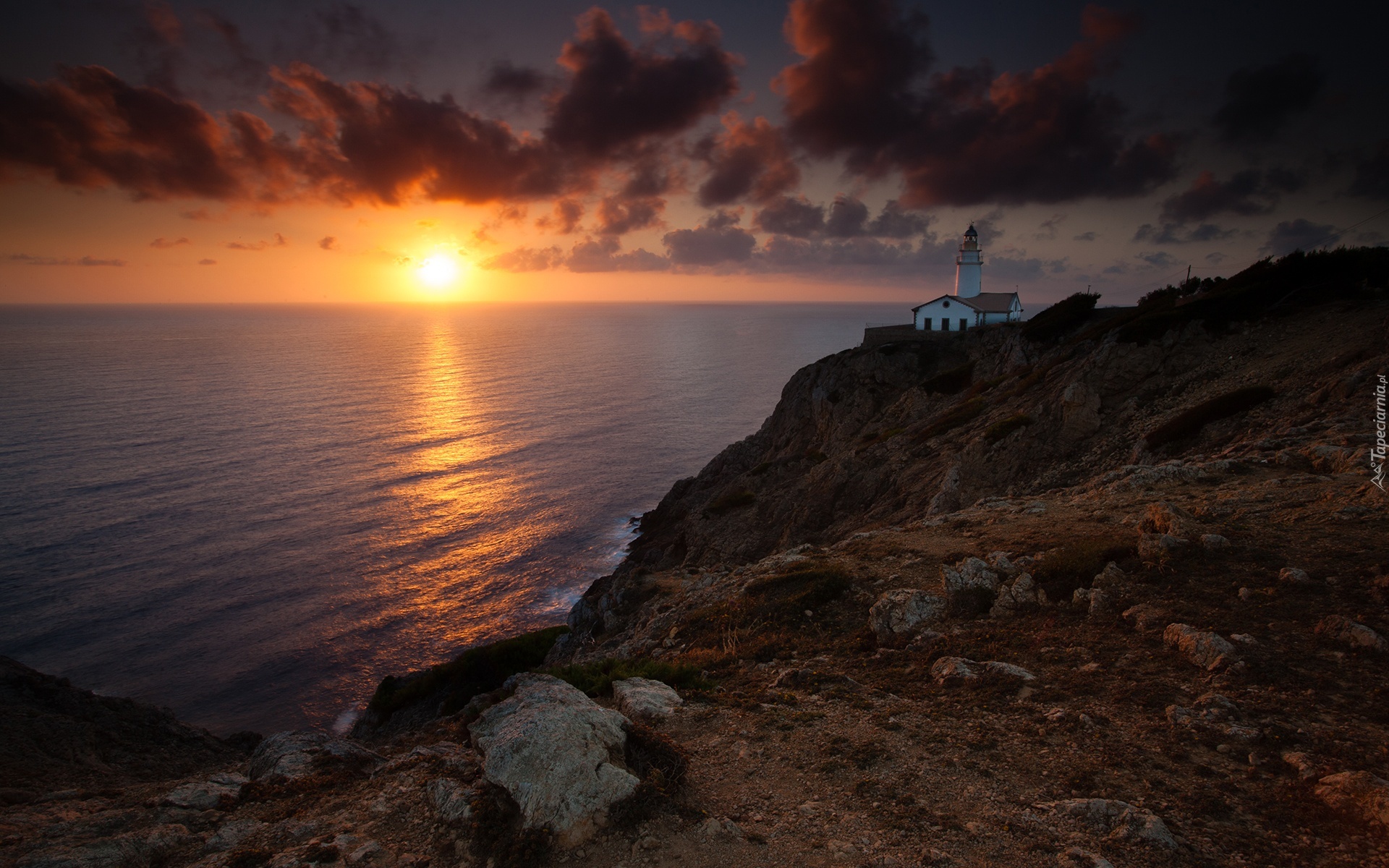 Edytor tapety: Morze, Latarnia morska , Zachód słońca, Kamienie