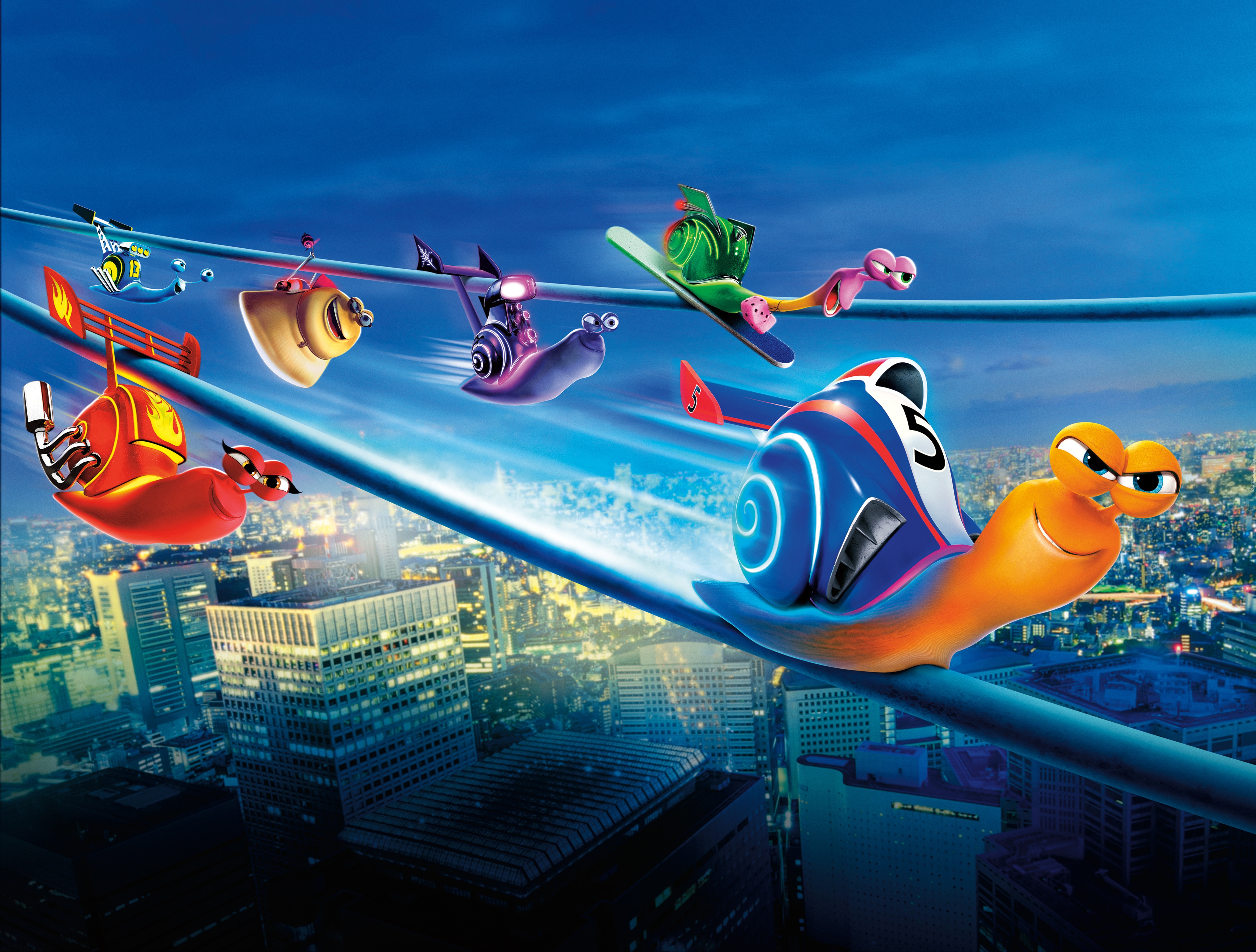 Edytor tapety: Miasto, Linie, Ślimaki kolorowe, Niebieskie tło